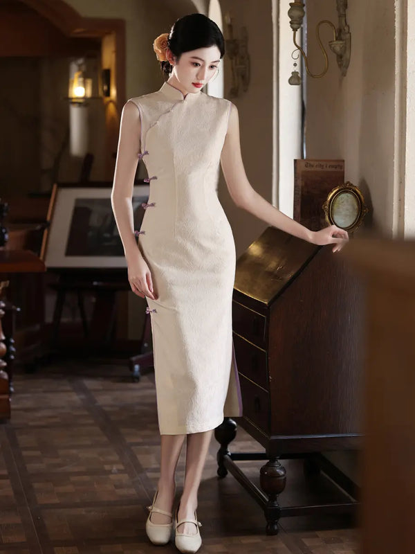 Cream White Sleeveless Jacquard Qipao with Purple Trim
