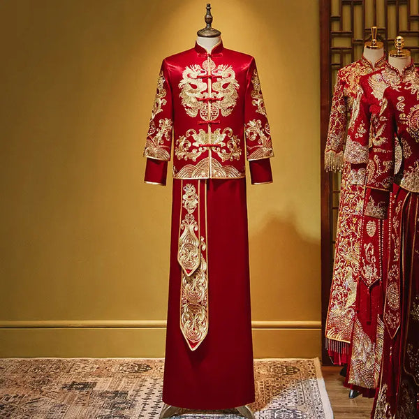 Traditional Red Groom Dragon Tang Suit (Ma Gua)| Blissful