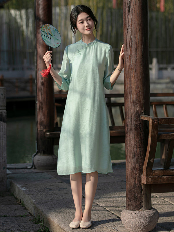 Green Modern A-Line Tencel Jacquard Loose Cheongsam Qipao Dress