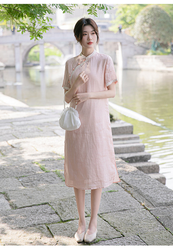 Light Apricot Embroidered Ramie Loose Qipao Dress
