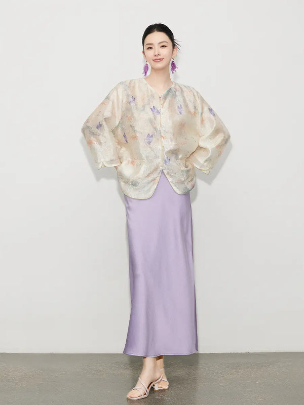 New Chinese Style Butterfly Sheer Top & Lilac Skirt Set