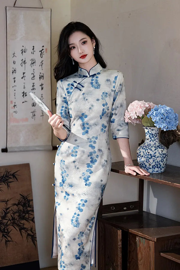 Blue/Green Plum Blossom Long Sleeves Qipao Cheongsam Dress