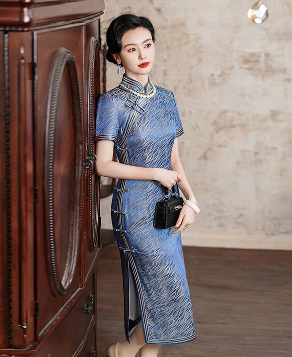Blue Mulberry Silk Qipao Dress with Golden Trim