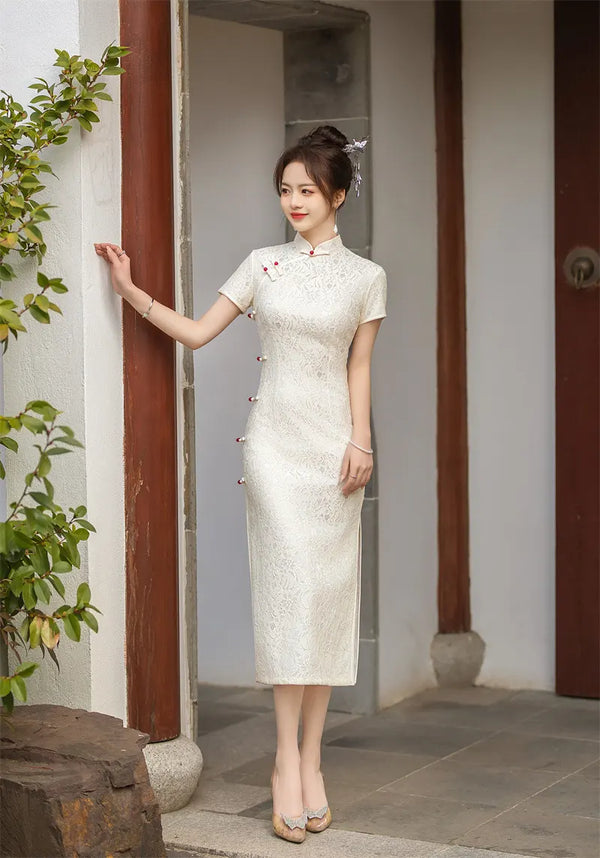 Weißes, florales, modernes Qipao aus Spitze mit roten Froschknöpfen