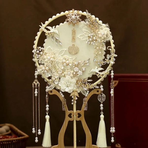 Elfenbeinweißer und goldener chinesischer Braut-Handfächer | Perlmutt