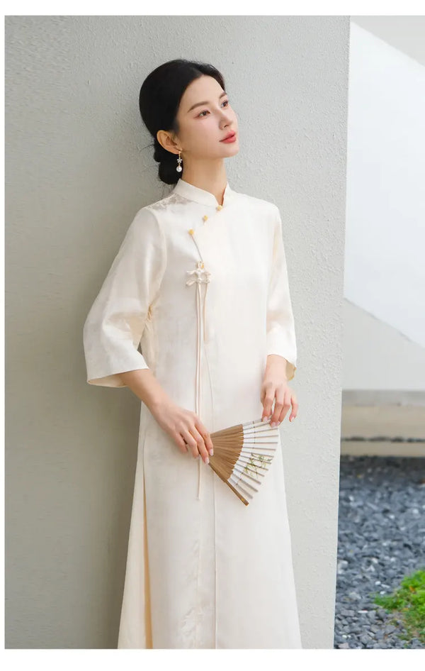 Elfenbeinfarbenes, lockeres Qipao-Cheongsam-Kleid – Neues, chinesisches Zen-inspiriertes Design