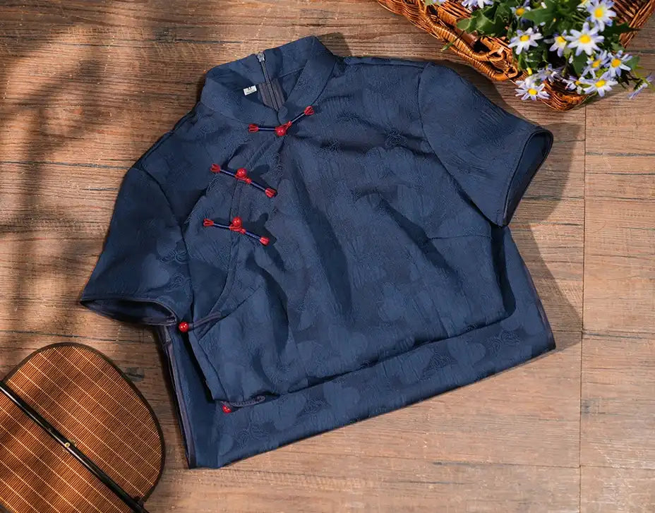 Marineblaues Jacquard-Schmetterlings-Cheongsam – mittellanges modernes Qipao