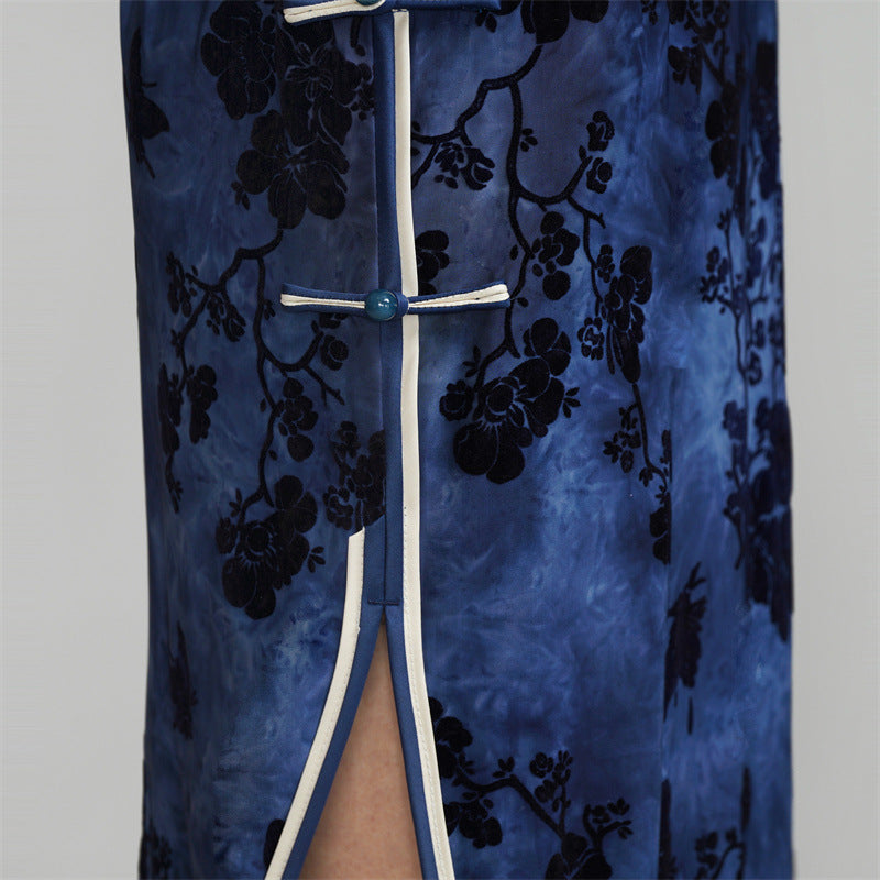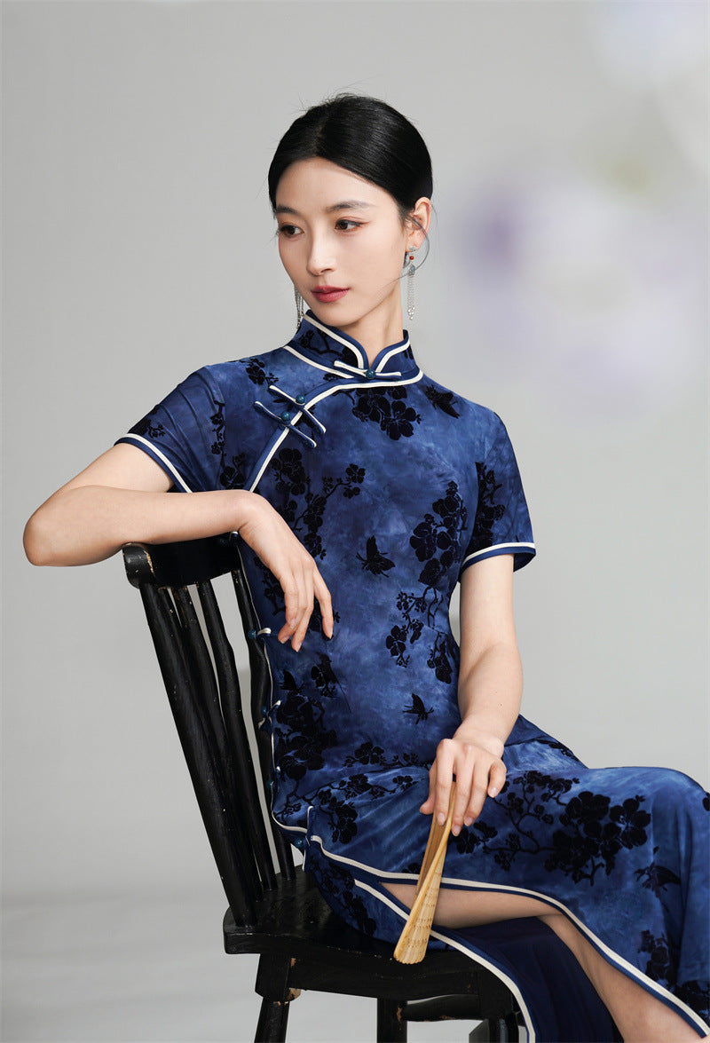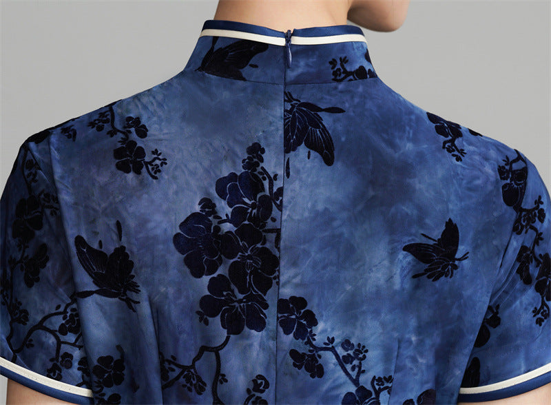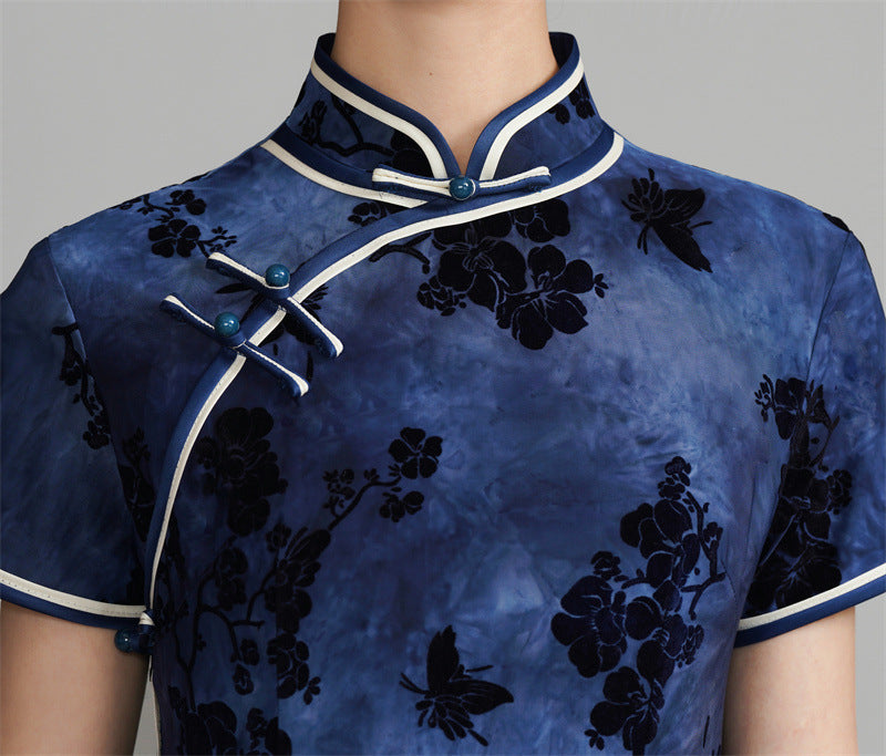 Dunkelblaues, kurzärmliges Qipao-Kleid aus Samt mit Blumenmuster