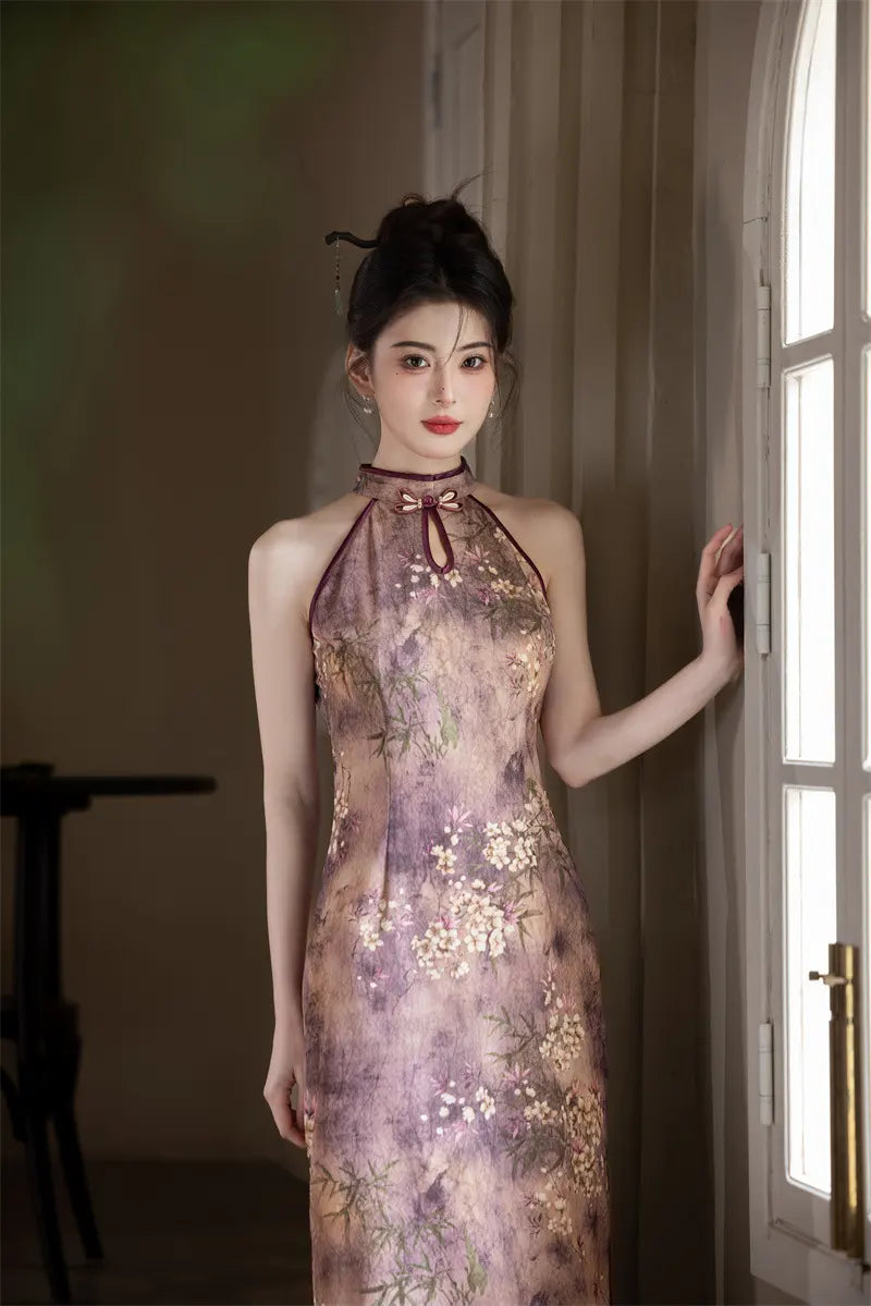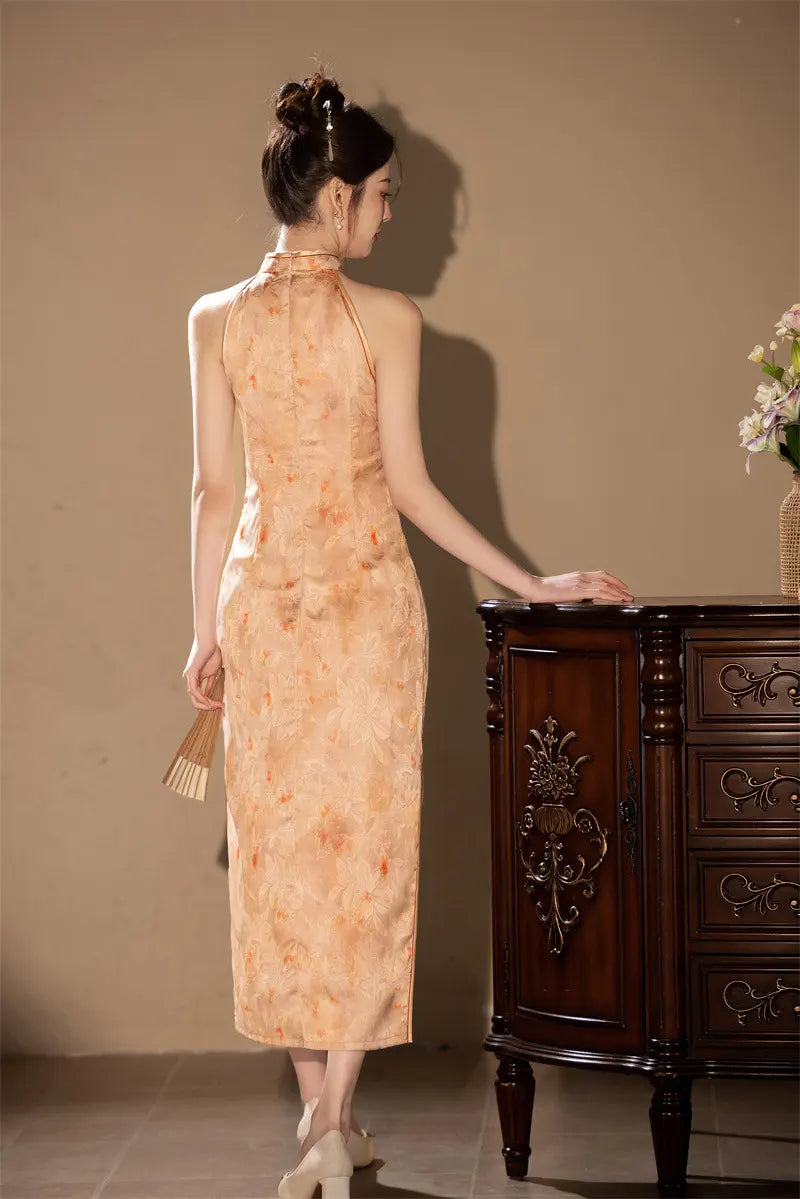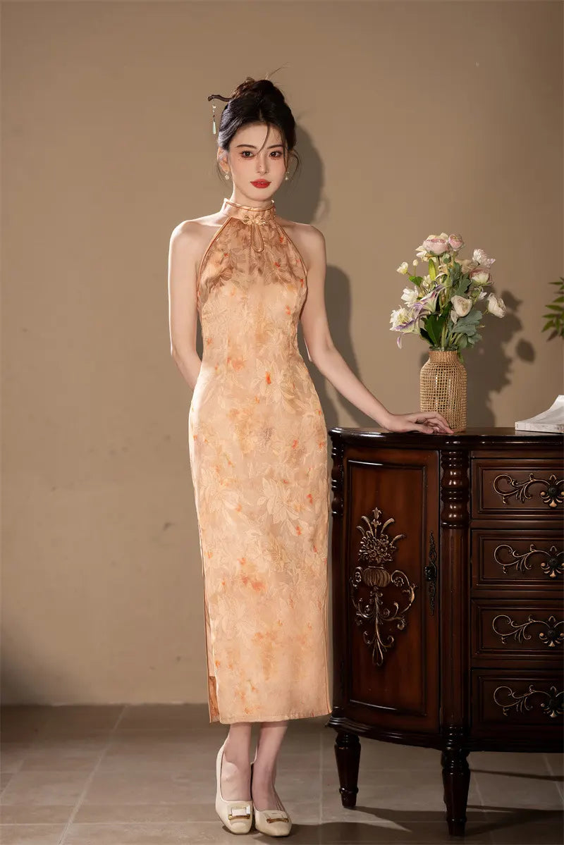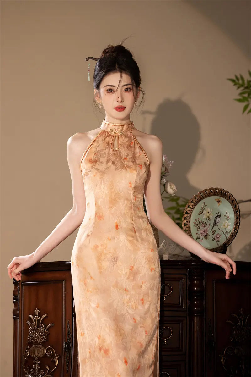 Mit diesem atemberaubenden Neckholder-Qipao (Cheongsam)-Kleid mit elegantem, ärmellosem Schnitt und hohem Stehkragen ziehen Sie alle Blicke auf sich. Dieses Kleid aus hochwertigem Stoff mit zartem Blumenmuster verbindet moderne Eleganz mit zeitlosem chinesischen Charme.