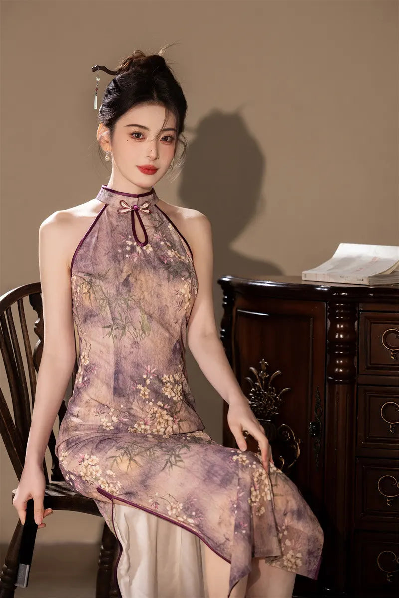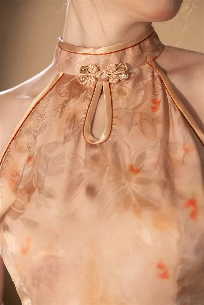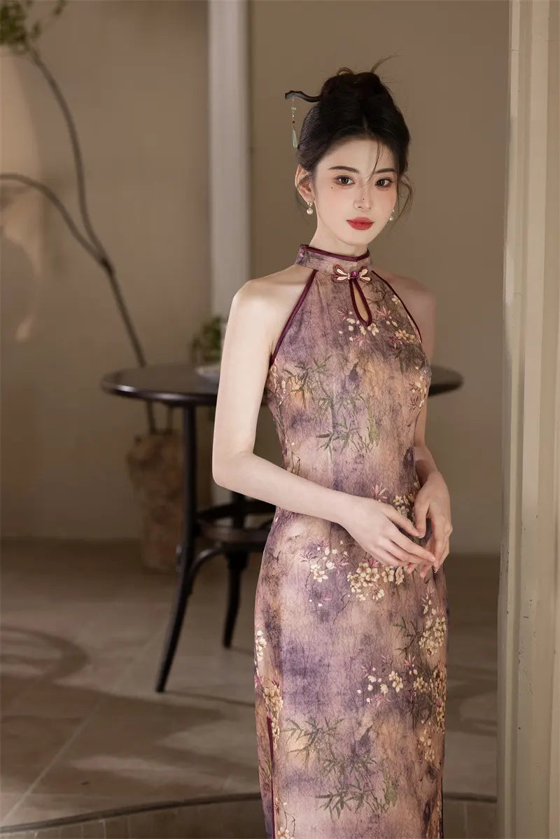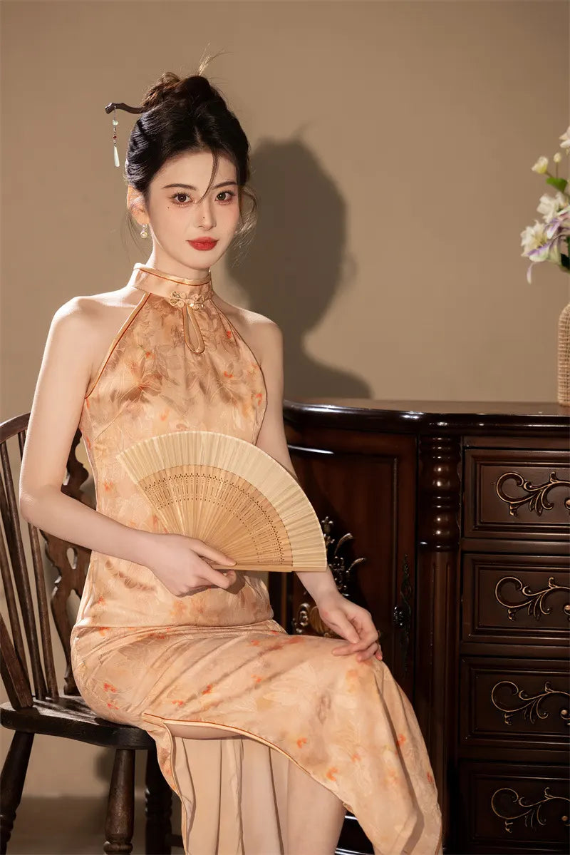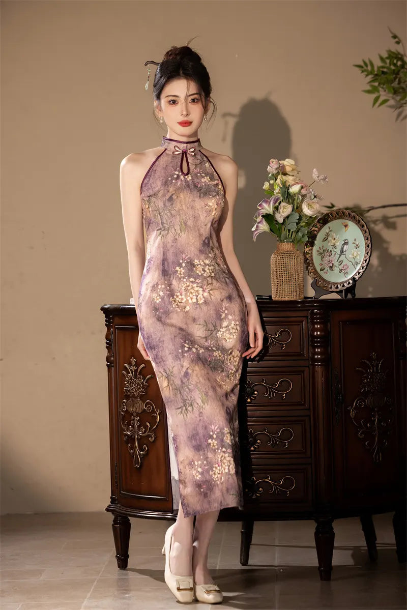 Mit diesem atemberaubenden Neckholder-Qipao (Cheongsam)-Kleid mit elegantem, ärmellosem Schnitt und hohem Stehkragen ziehen Sie alle Blicke auf sich. Dieses Kleid aus hochwertigem Stoff mit zartem Blumenmuster verbindet moderne Eleganz mit zeitlosem chinesischen Charme.