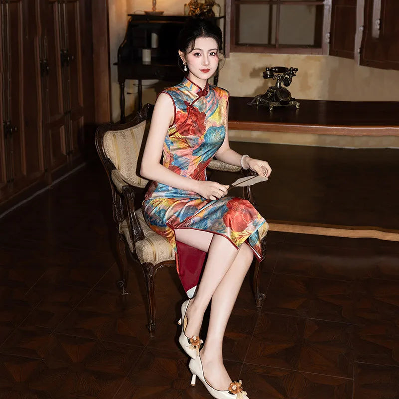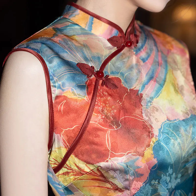 Bringen Sie mit diesem ärmellosen Qipao-Kleid (Cheongsam) mit Blumenmuster einen kräftigen Farbtupfer in Ihre Garderobe. Das aus weichem Acetat-Imitat gefertigte Kleid bietet eine glatte, seidige Textur mit leichtem Fall – perfekt für Eleganz bei warmem Wetter.