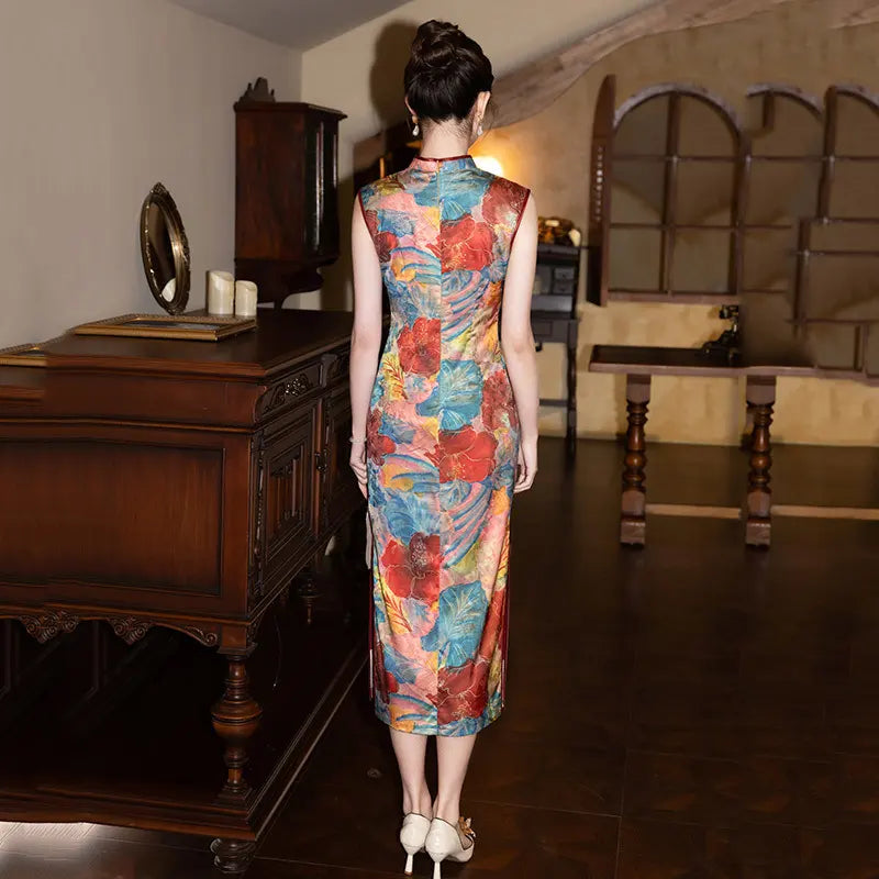 Ärmelloses Qipao-Cheongsam-Kleid mit Blumenmuster | Aurora Blossom