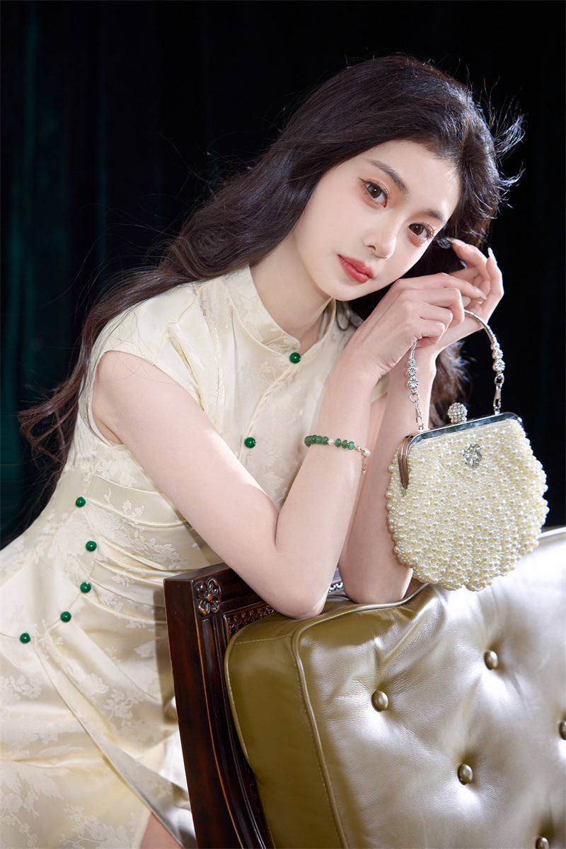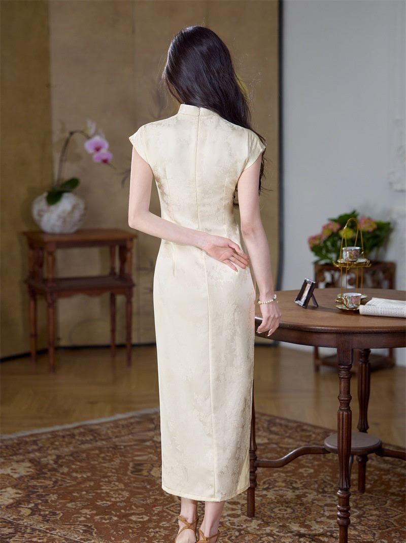 Elfenbeinfarbenes Jacquard-Qipao mit Blumenmuster und grünen Knöpfen