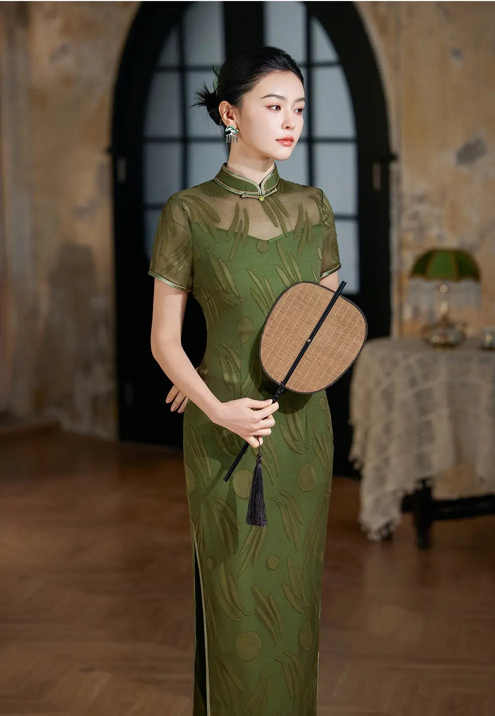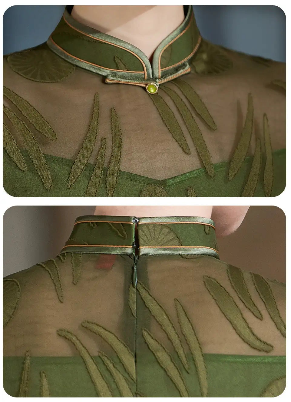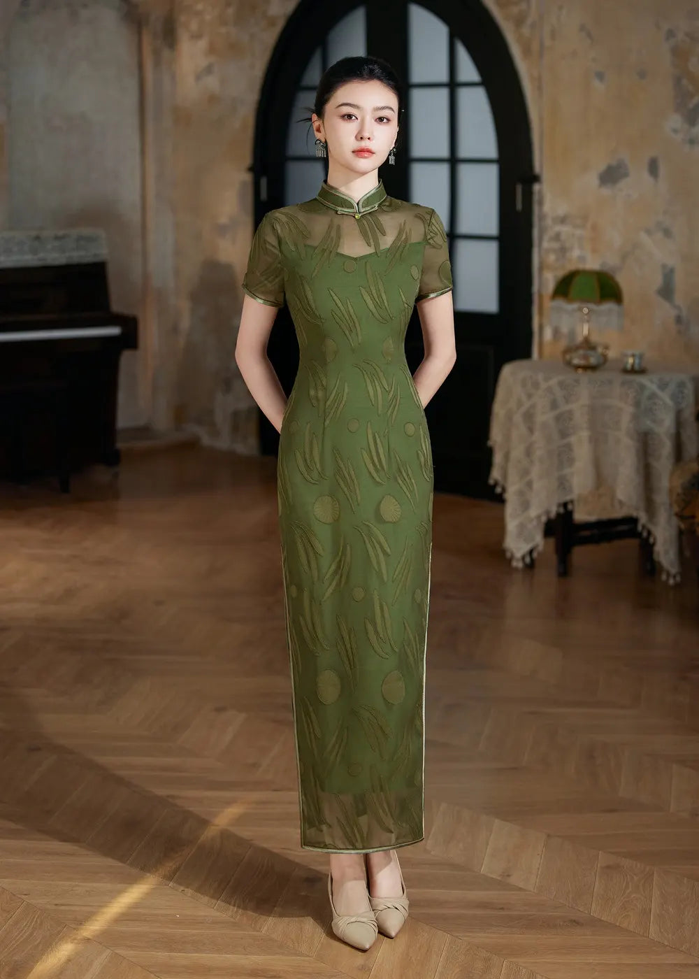Erleben Sie zeitlose Eleganz mit diesem eleganten, grünen, transparenten Qipao-Cheongsam-Kleid, einer perfekten Mischung aus traditionellem Charme und moderner Anmut. Mit einer zarten, transparenten Überlage und aufwendigen Jacquardmustern unterstreicht dieses Cheongsam feminine Eleganz und bewahrt gleichzeitig klassische chinesische Designelemente.