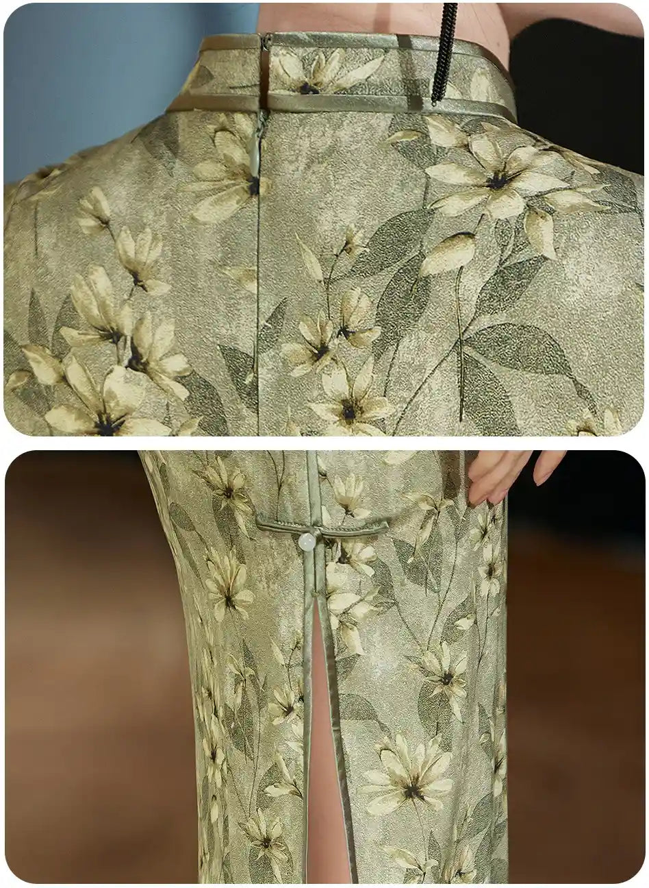 Dunkelgrünes Qipao-Kleid aus Seide mit Blumenmuster | Daisy
