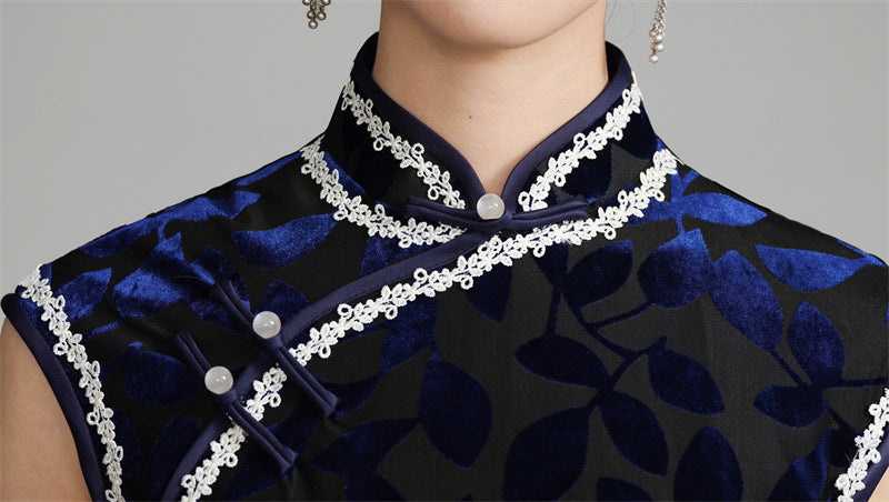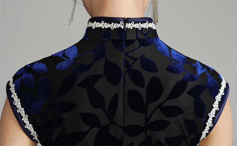Marineblaues, langes Qipao-Kleid aus Samt mit Spitzenbesatz