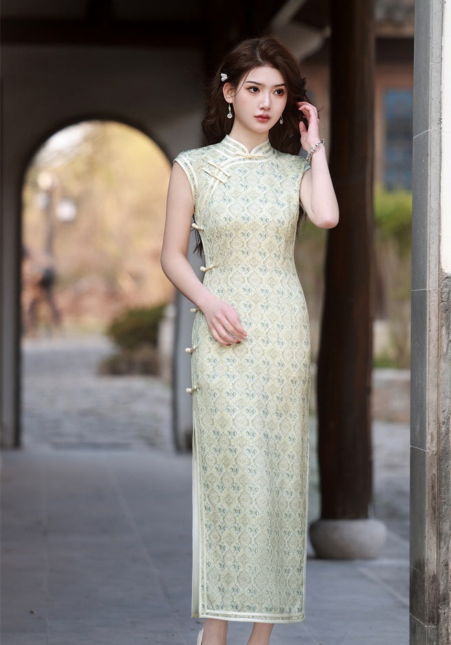 Design: Traditionelles Qipao mit modernem Touch, mit hohem Stehkragen, Flügelärmeln und aufwendigen seitlichen Knotenknöpfen.