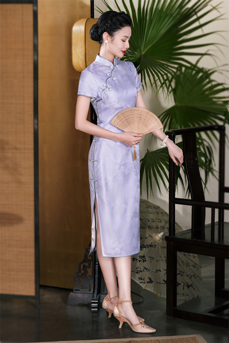 Dieses traditionelle chinesische Qipao (Cheongsam)-Kleid in Lavendelviolett ist aus luxuriöser Seide mit dezentem Glanz und zarten Mustern gefertigt. Dieses Outfit eignet sich perfekt für Hochzeiten, formelle Anlässe, kulturelle Veranstaltungen oder Feiern, die eine Mischung aus traditioneller und moderner Eleganz erfordern.