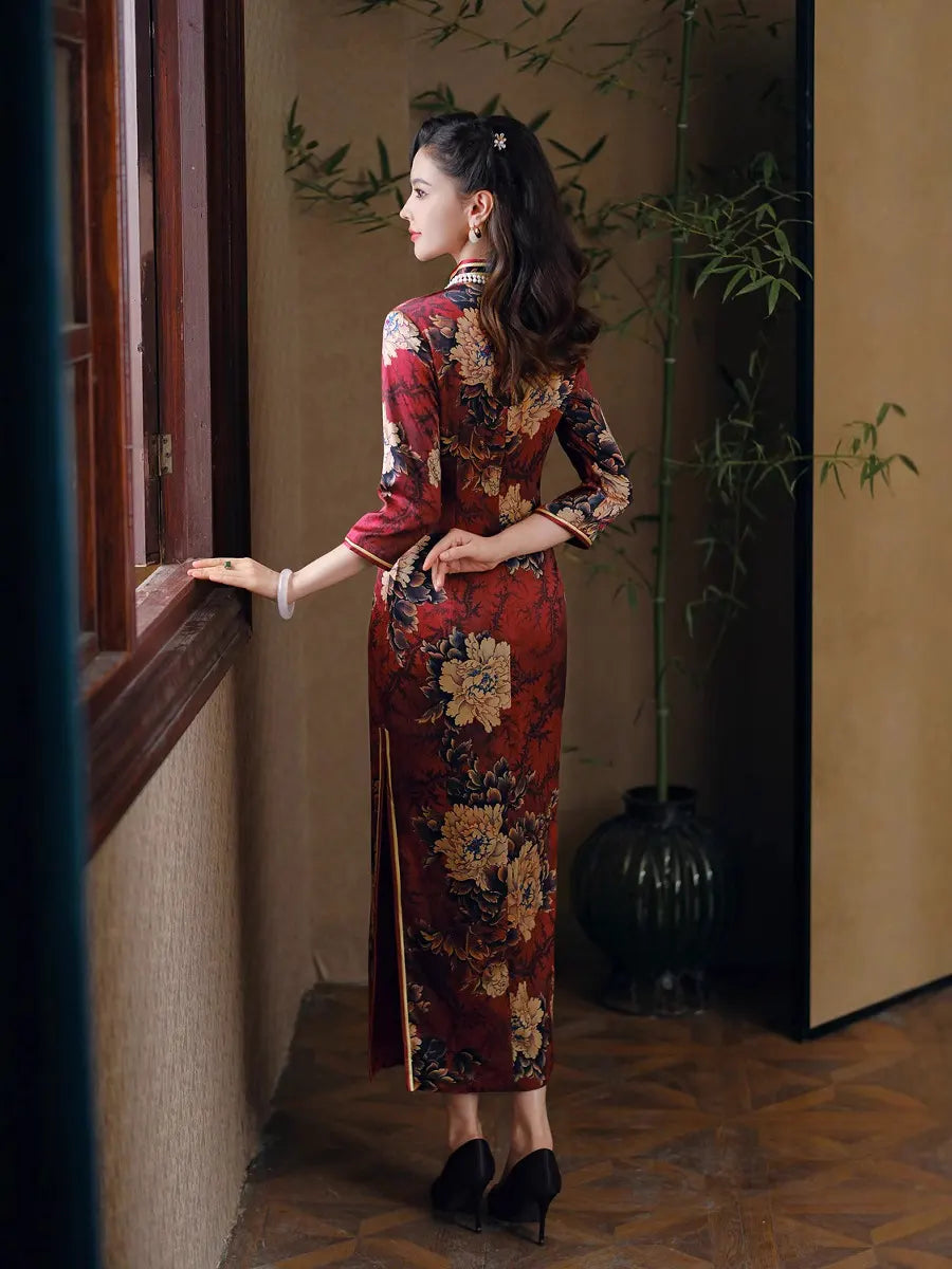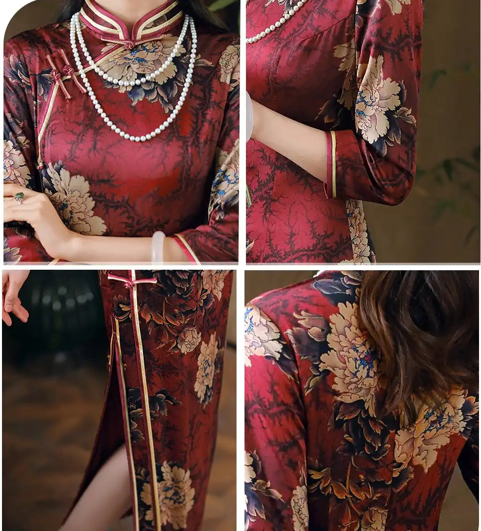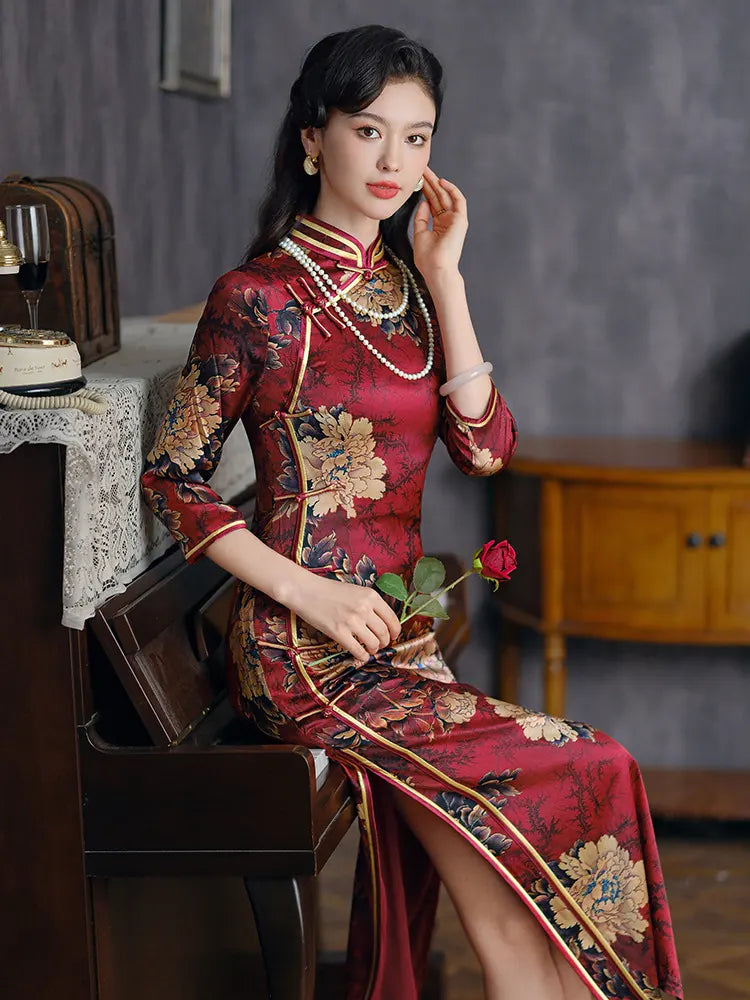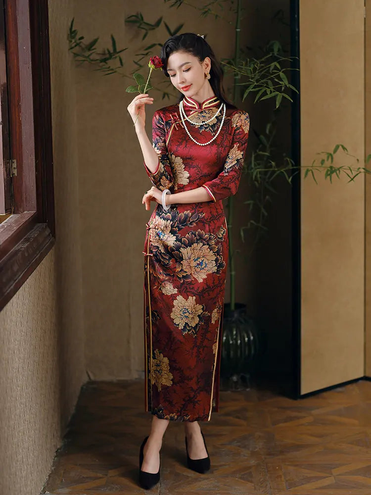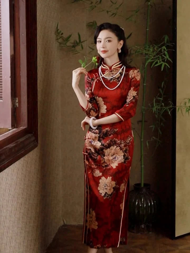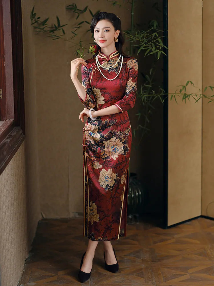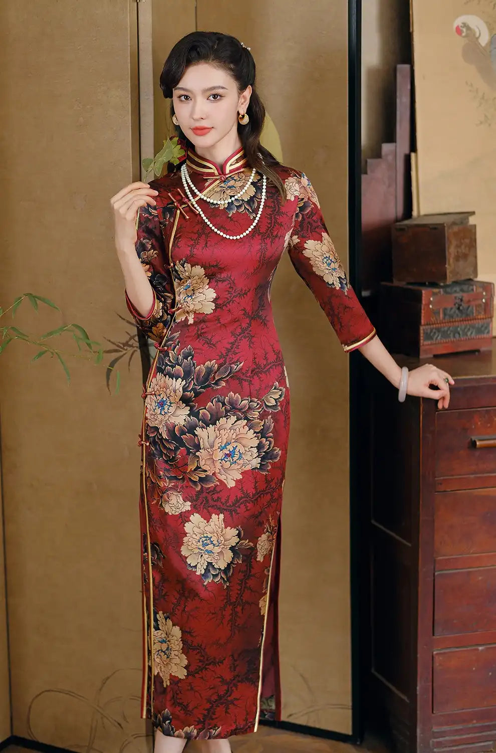 - Design: Klassisches rotes Qipao mit Pfingstrosen-Blumenmuster und 3/4-Ärmeln