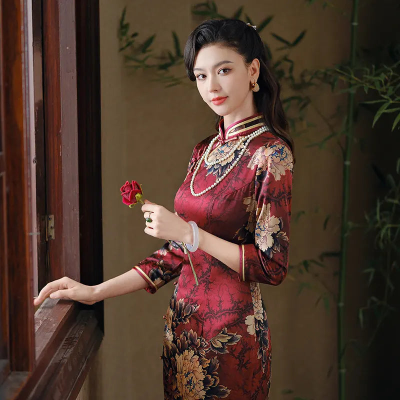 Rotes 3/4-Ärmeliges Qipao aus Seide mit Blumenmuster | Pfingstrose