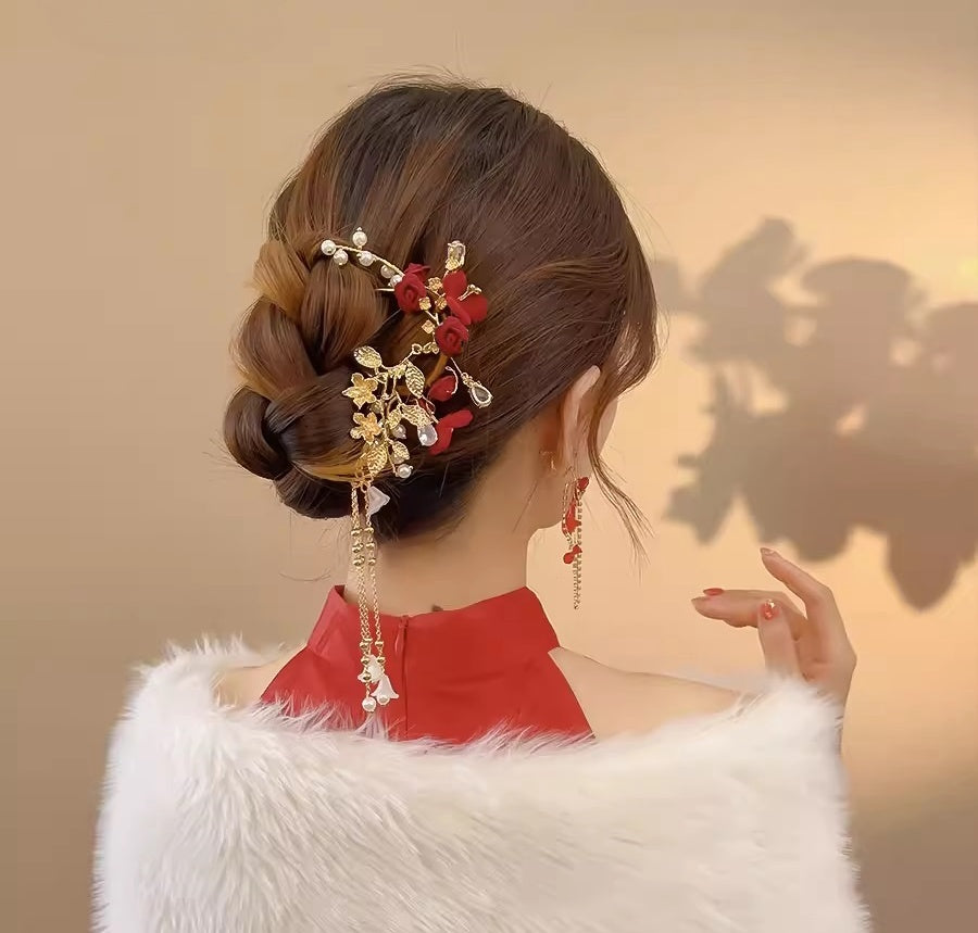 Verleihen Sie Ihrer Frisur mit dieser exquisiten rot-goldenen Blumenhaarnadel einen Hauch von Eleganz und Raffinesse. Verziert mit hängenden Perlenketten und Blumenanhängern, die eine anmutige und feminine Note verleihen. Diese Haarnadel kombiniert traditionellen Charme mit modernem Design. Sie ist eine einfache und hübsche Ergänzung zu Ihrer Hochsteckfrisur und verleiht Ihrer chinesischen Hochzeit/Teezeremonie einen Hauch von Eleganz.