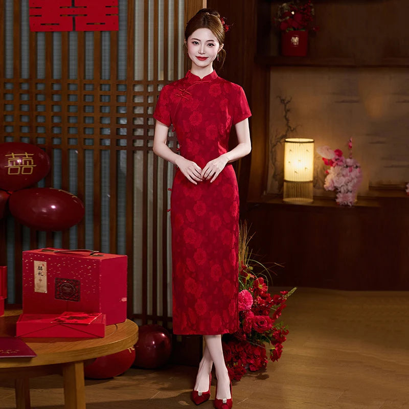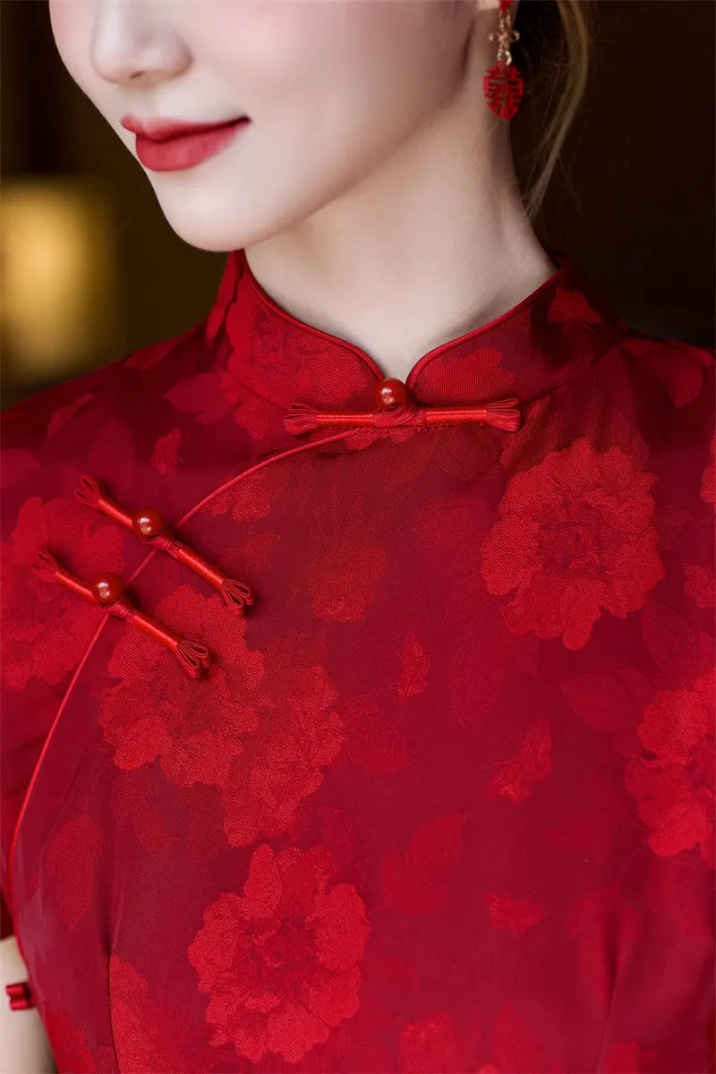 Mit Stehkragen, kurzen Ärmeln und schmaler Passform verkörpert dieses Qipao traditionellen Charme und ist gleichzeitig modern und tragbar. Das aufwendige Jacquard-Blumenmotiv verleiht Tiefe und Raffinesse, während die Midilänge es sowohl für formelle als auch für festliche Anlässe elegant macht.