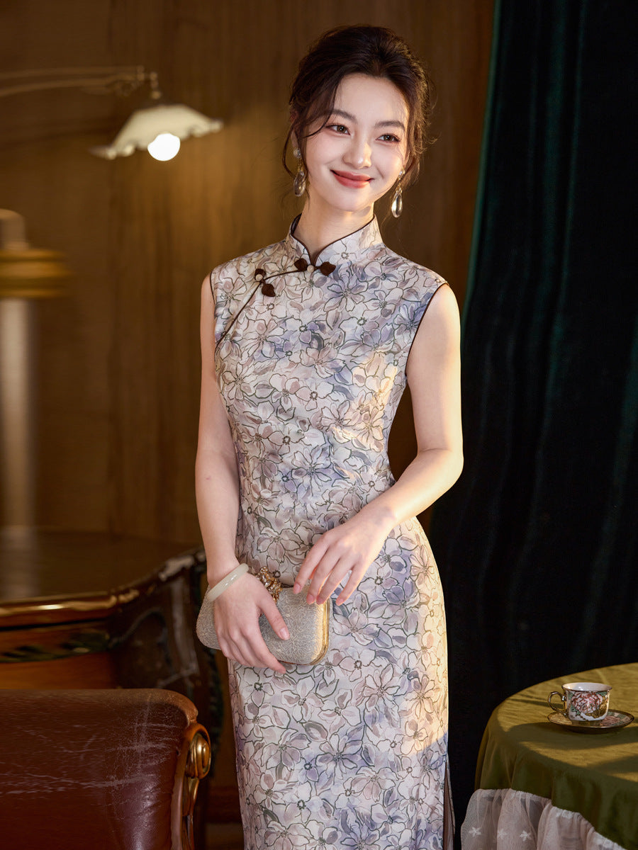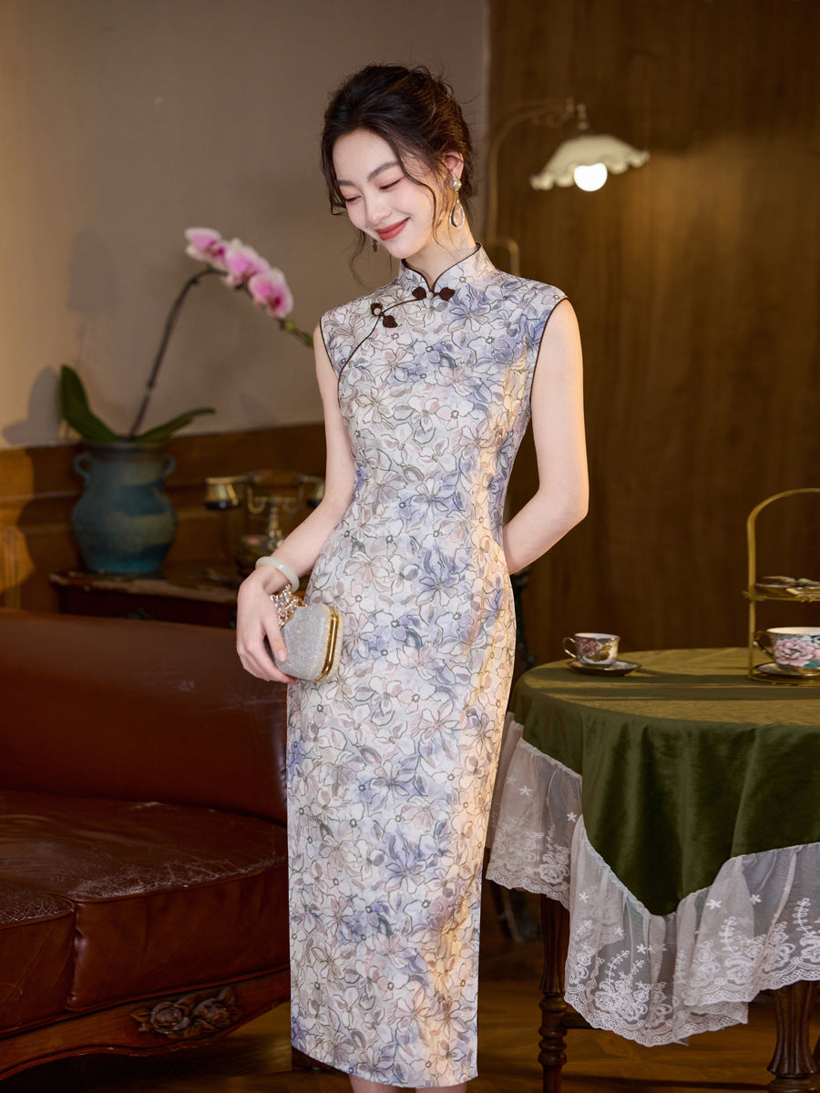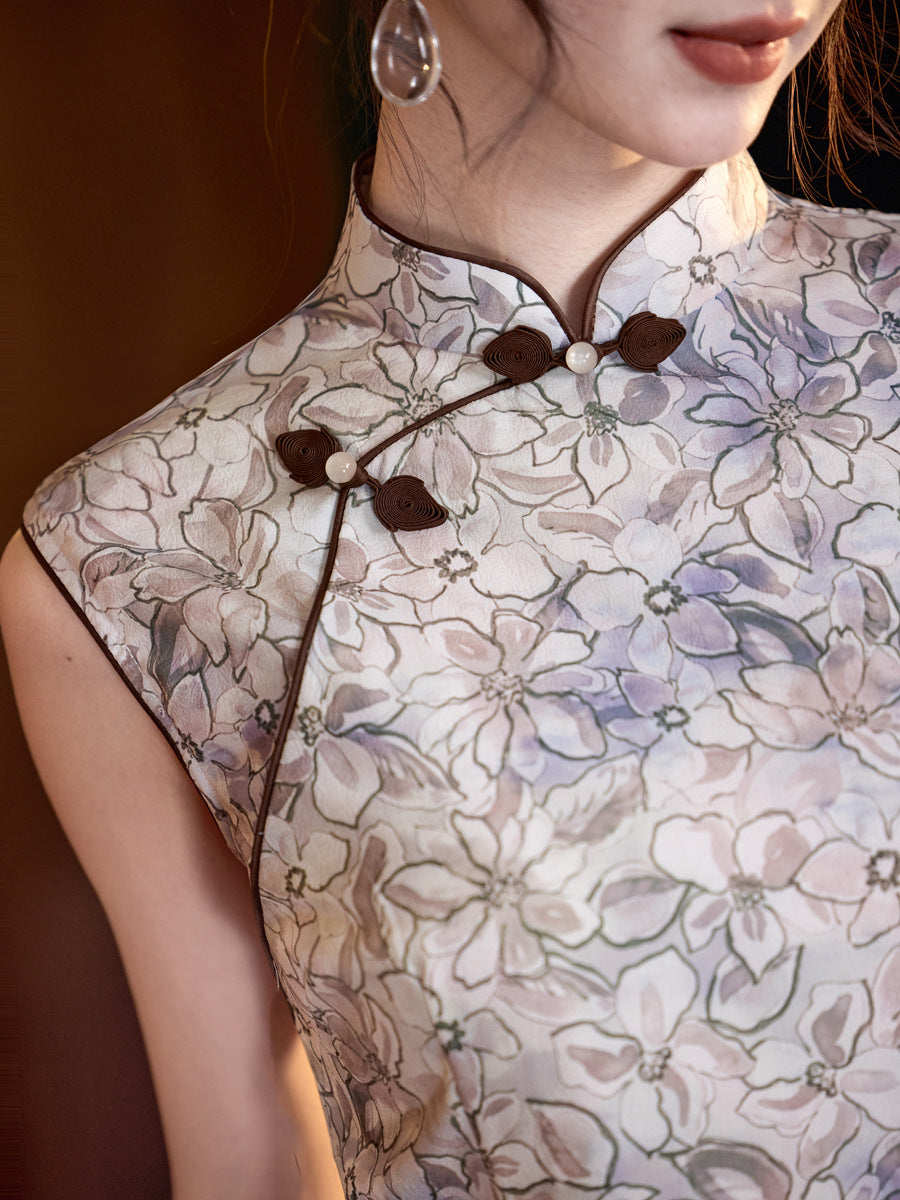 Ärmelloses Qipao-Kleid mit Blumenmuster | Ethereal Bloom