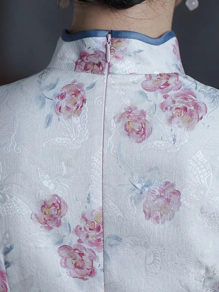 - Design: Traditionelles ärmelloses Qipao (Cheongsam) mit hohem Stehkragen, Seitenschlitzen und eleganten Paspeldetails sowie einem klassischen Blumenmuster.