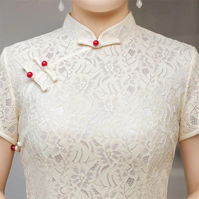 - Design: Moderne Qipao-Silhouette mit floraler Spitze, Stehkragen und kontrastierenden roten Froschknopfverschlüssen.