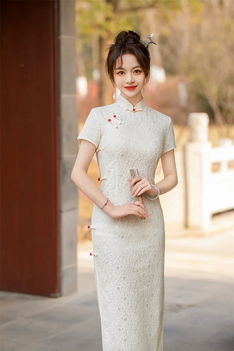 Versprühen Sie raffinierten Charme in unserem wunderschönen weißen Qipao aus floraler Spitze. Diese moderne Interpretation des klassischen Cheongsam besticht durch zarte, florale Spitze, einen raffinierten hohen Stehkragen und elegante Flügelärmel. Das Kleid ist mit leuchtend roten, traditionellen Froschknöpfen akzentuiert, die einen Farbtupfer und einen Hauch authentischer Details verleihen.
