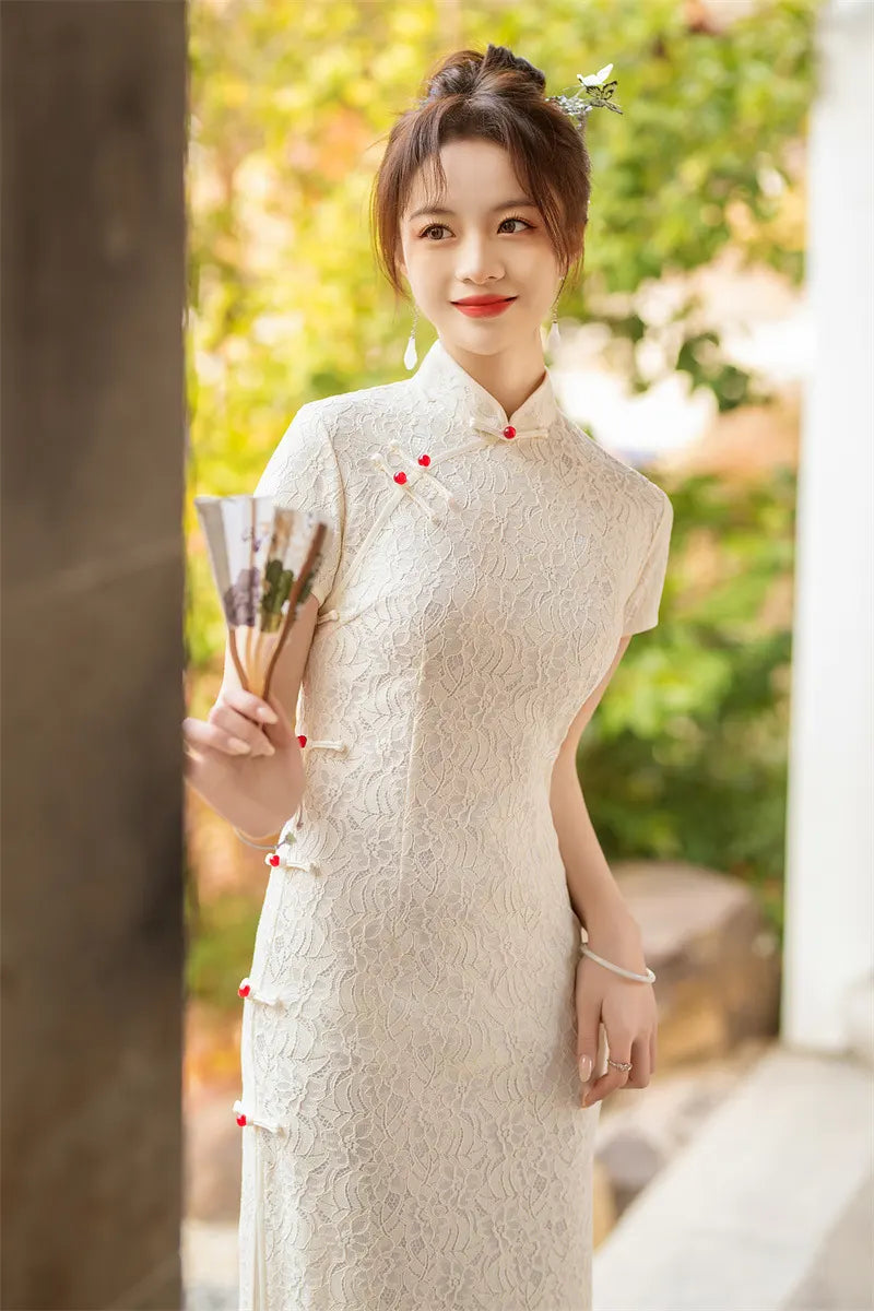 Weißes, florales, modernes Qipao aus Spitze mit roten Froschknöpfen