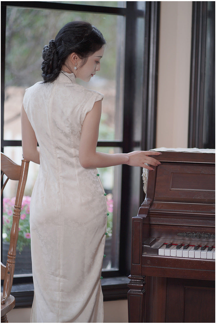Genießen Sie die exquisite Eleganz dieses weißen Cheongsam-Kleides. Das knöchellange Kleid aus Jacquardstoff mit ärmellosem Design und traditionellem Stehkragen ist mit zwei dezenten Seitenschlitzen verziert und verleiht ihm eine zeitlose und elegante Silhouette – perfekt für jeden besonderen Anlass.