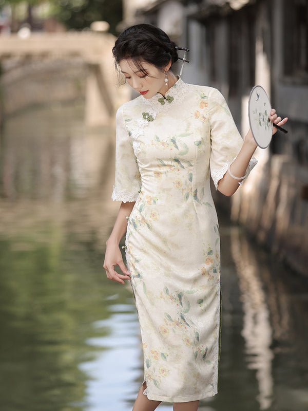 Robe Qipao fleurie à manches mi-longues et bordure en dentelle