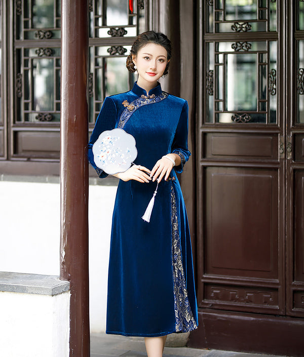 Robe Qipao Cheongsam en velours fleuri bleu
