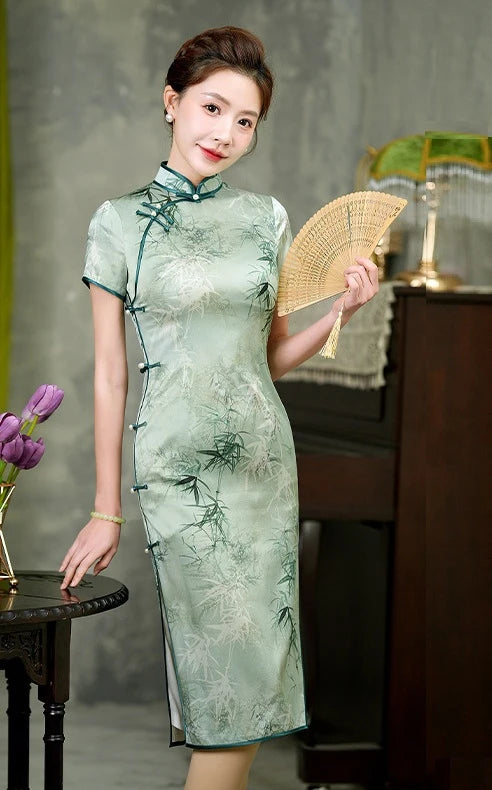 Robe Qipao en soie à imprimé feuilles de bambou vertes