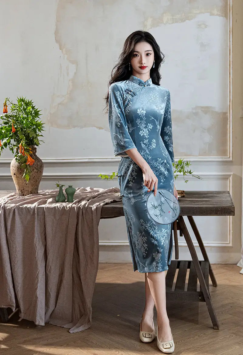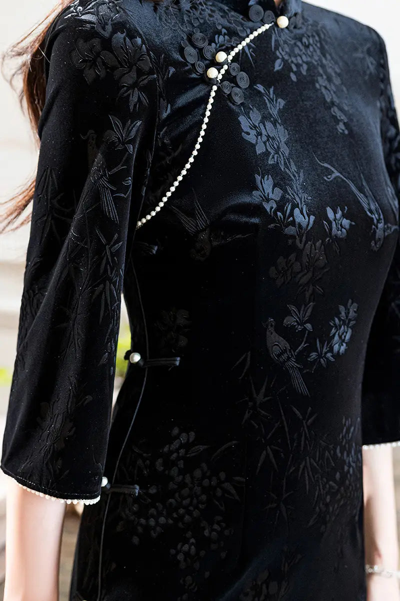 Qipao en velours jacquard noir/bleu à manches 3/4 et bordure en perles