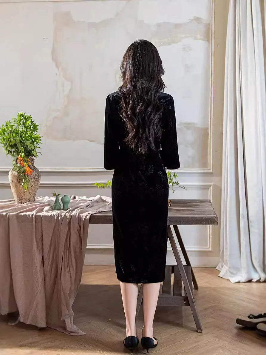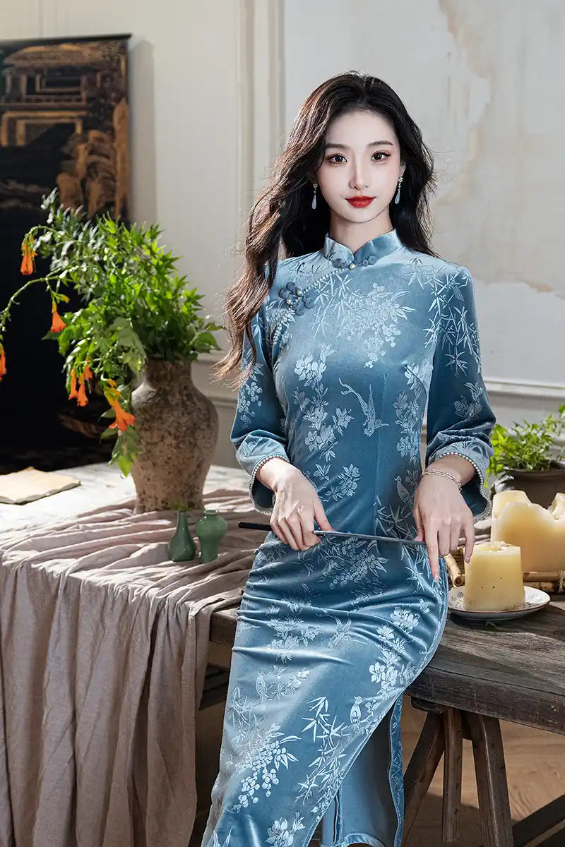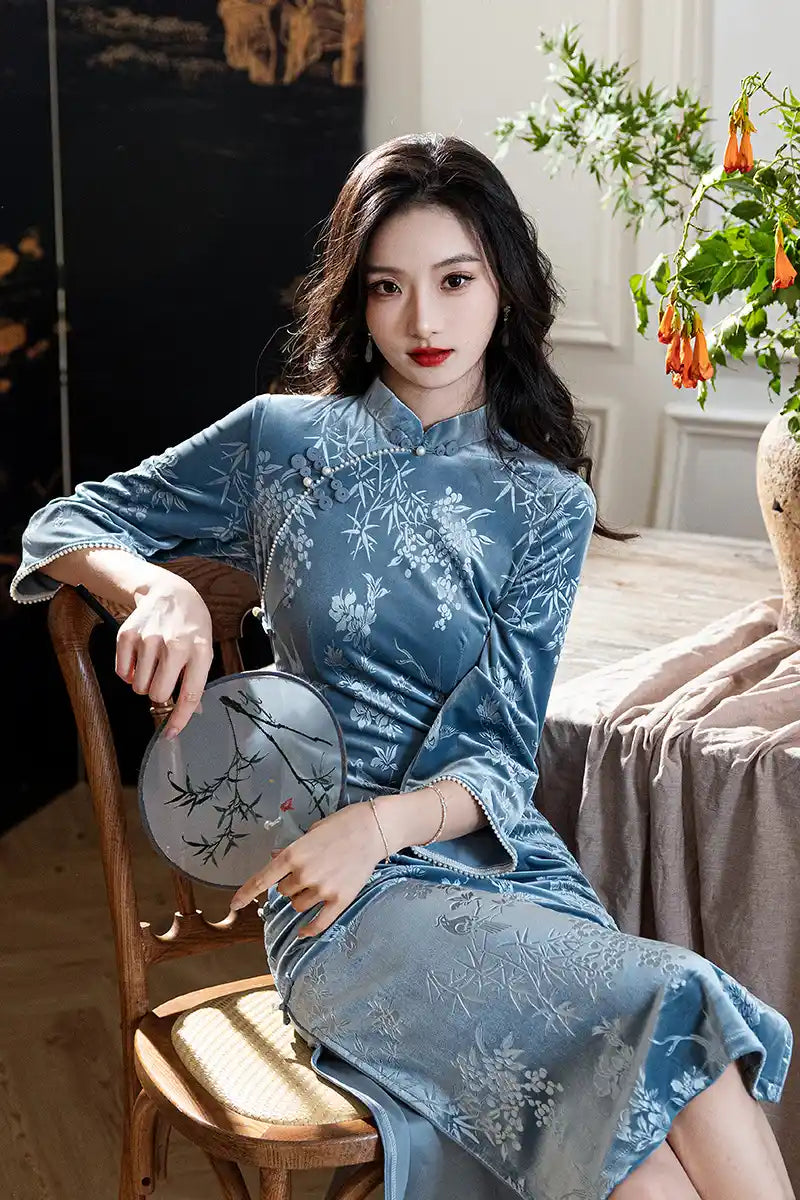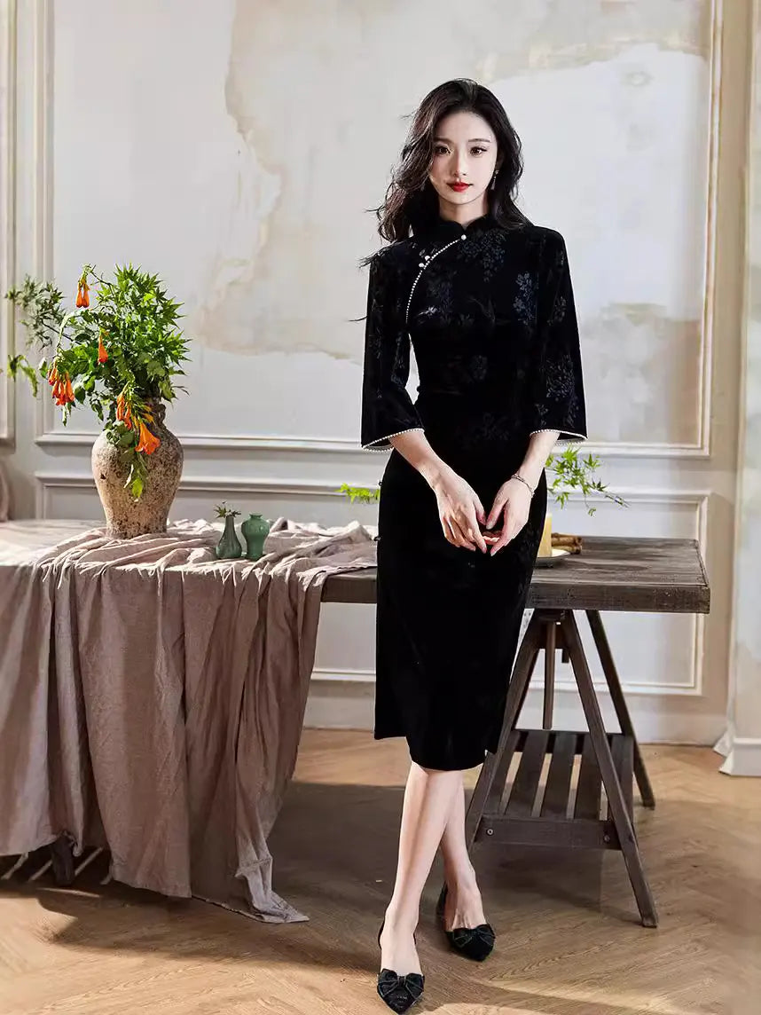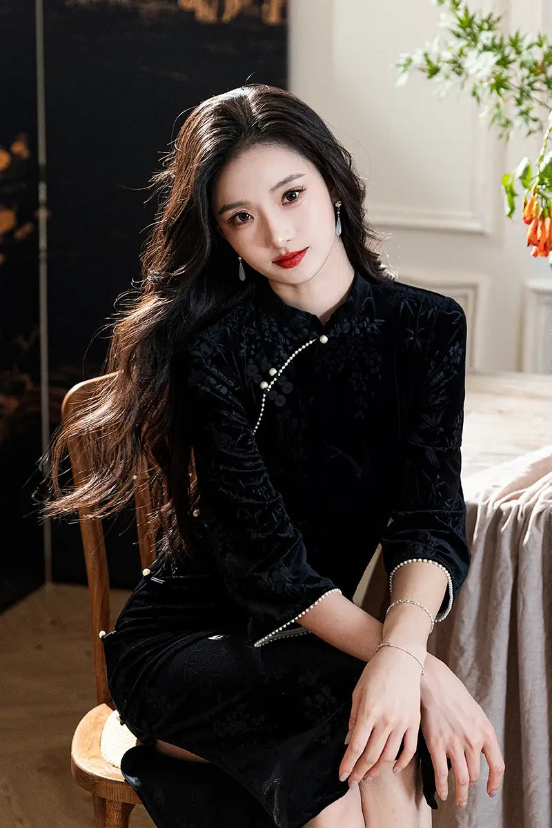 Entrez dans une sophistication sans effort avec ce cheongsam en velours orné de perles — un équilibre gracieux entre héritage et charme moderne.