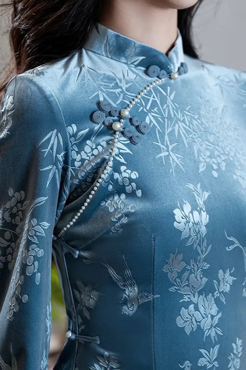 L'élégance intemporelle rencontre la sophistication moderne dans ce qipao en velours jacquard. Orné d'un délicat motif floral noir et bleu, ce vêtement respire la discrétion et le raffinement. Son col et ses manches ornés de perles apportent une touche de grâce lumineuse à cette silhouette cheongsam classique. Parfaitement ajusté, il sublime la silhouette tout en conservant une allure élégante et traditionnelle.