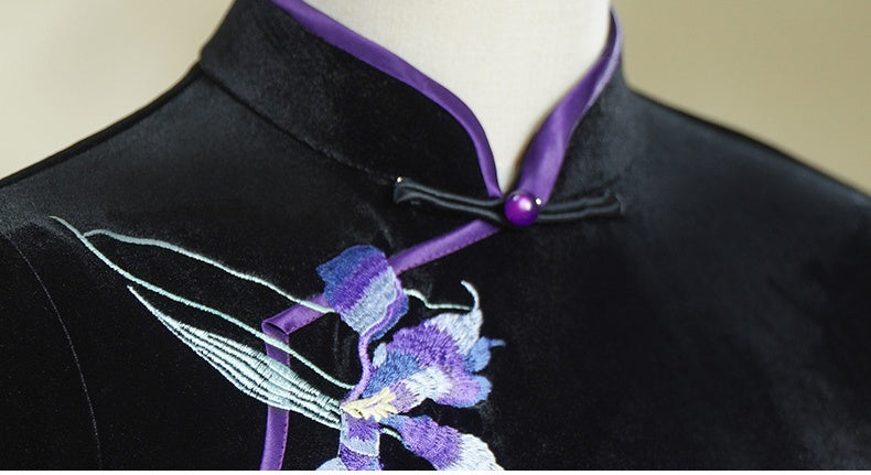 Il s'agit d'une robe cheongsam (qipao) au design intemporel et élégant. La robe est confectionnée en velours noir, présente une broderie florale violette délicate et complexe, un col mao avec une bordure violette. Les manches longues sont ornées de poignets bleus contrastants qui affichent des motifs traditionnels complexes, ajoutant à l'esthétique raffinée de la robe. Ce cheongsam est parfait pour les occasions formelles, incarnant un mélange de tradition culturelle et d'élégance moderne.