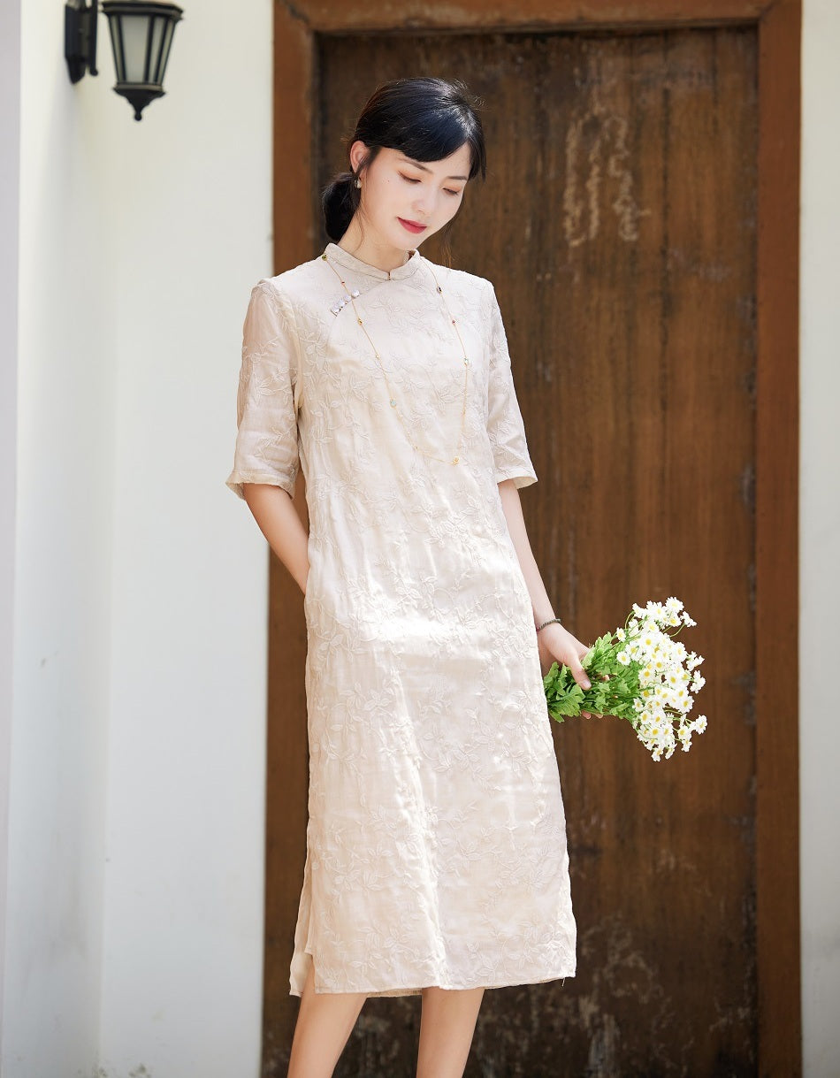 Robe Qipao ample brodée en ramie abricot clair