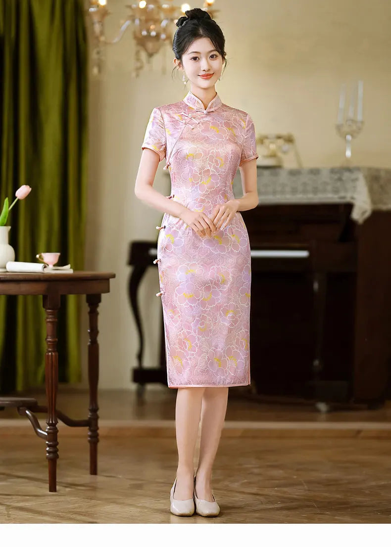 Robe Qipao à manches courtes en soie de mûrier à fleurs roses