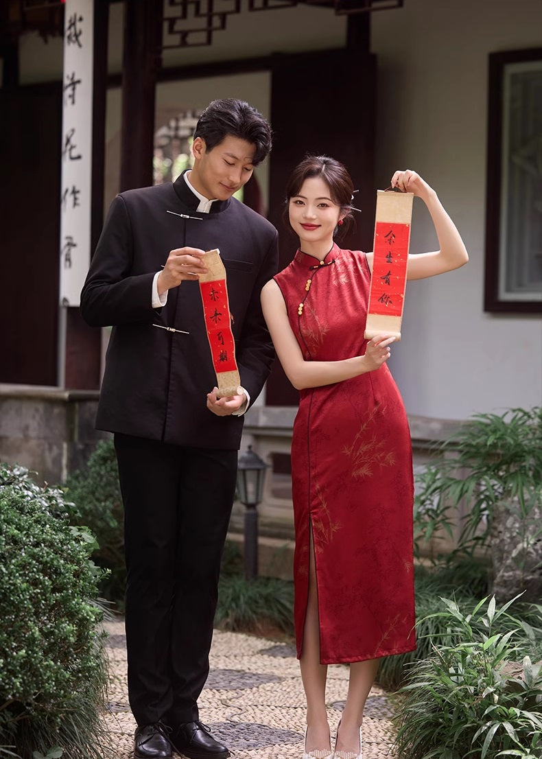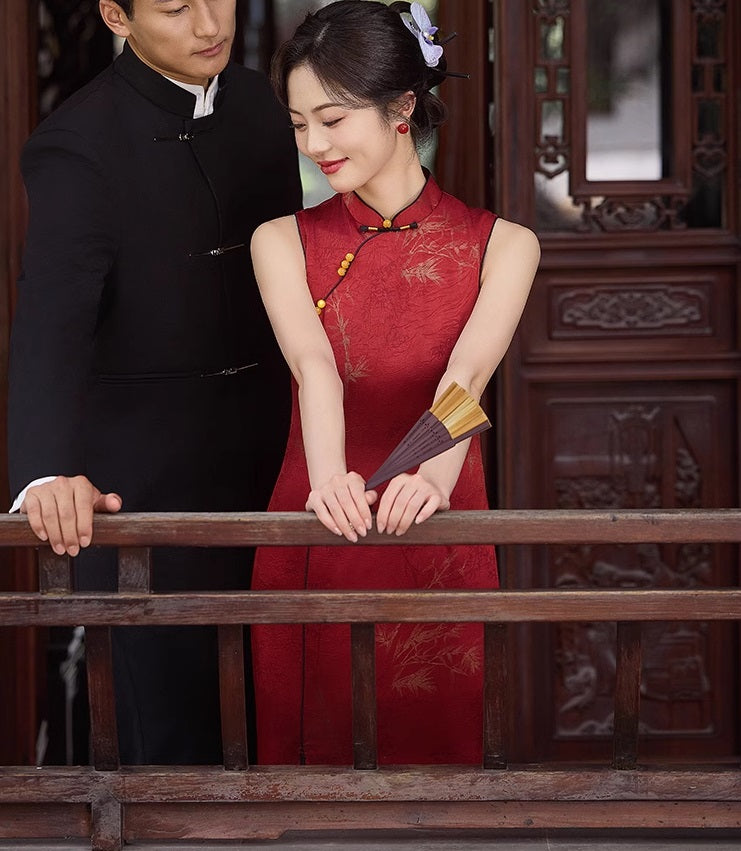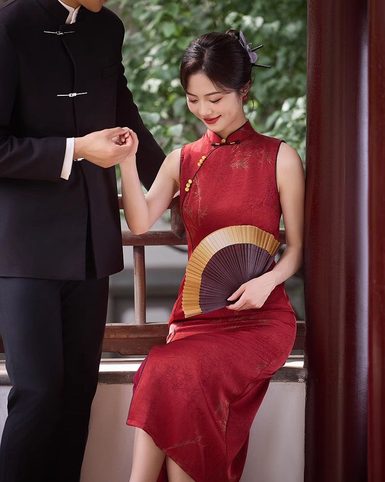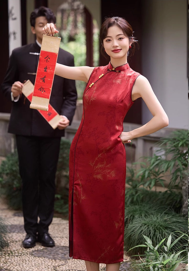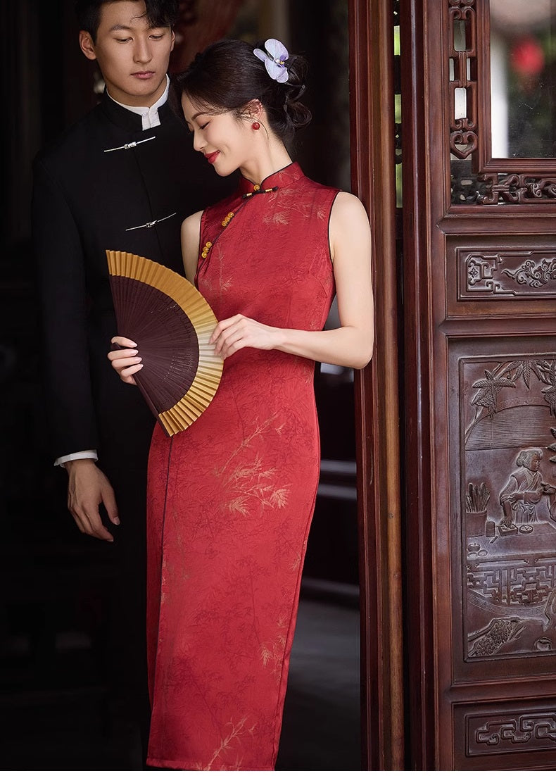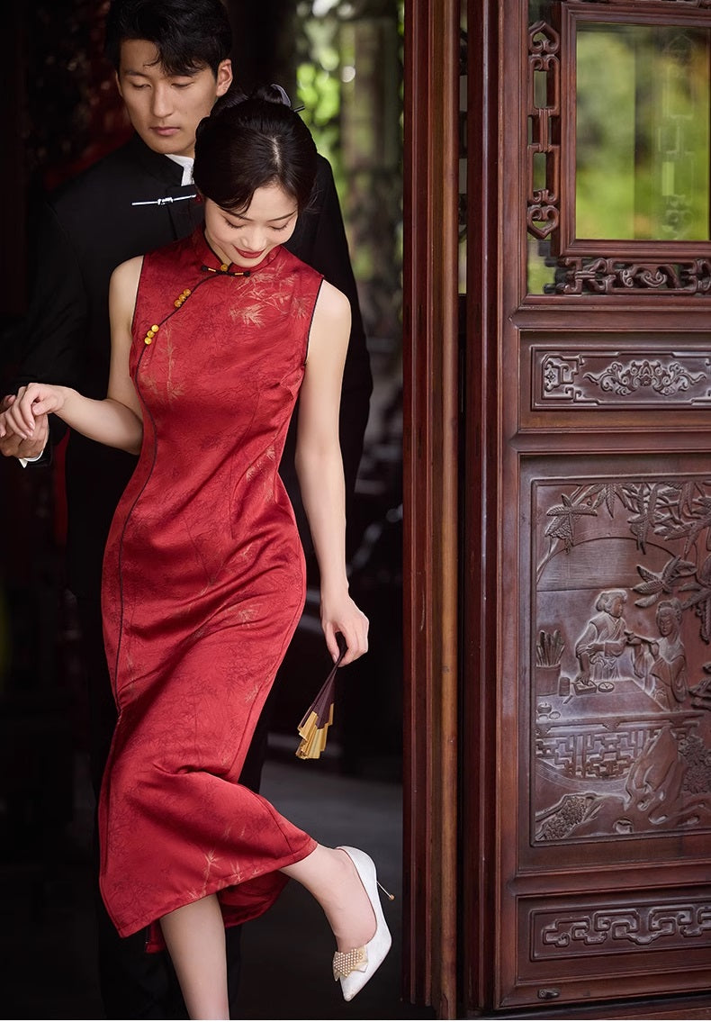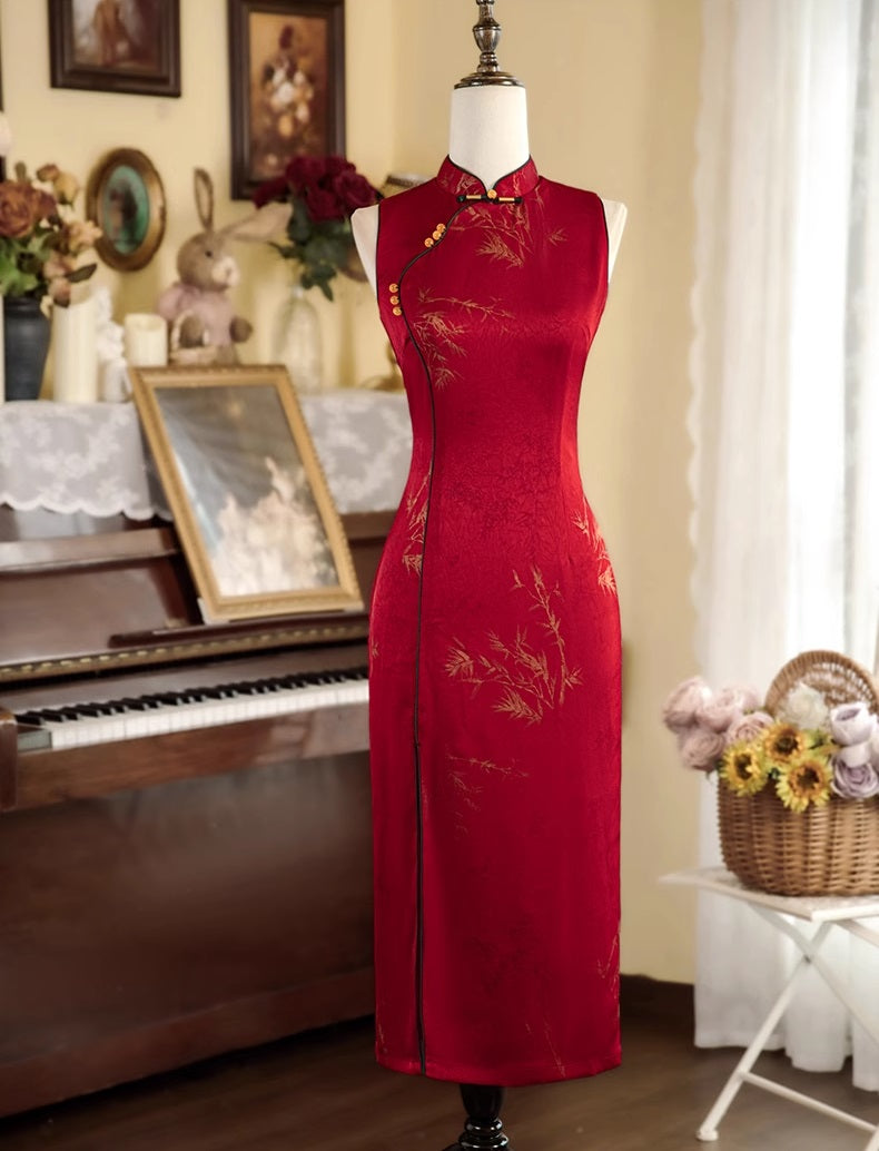 La robe Qipao (Cheongsam) est confectionnée dans un tissu jacquard rouge riche avec des motifs de feuilles de bambou dorés qui ajoutent une touche d'élégance. La silhouette ajustée accentue la silhouette, tandis que la coupe sans manches et la fente sur le devant apportent une touche de modernité à la tenue traditionnelle. Le Qipao est souvent associé à la culture chinoise, ce qui en fait un choix idéal pour les mariages, les cérémonies culturelles ou les célébrations festives.