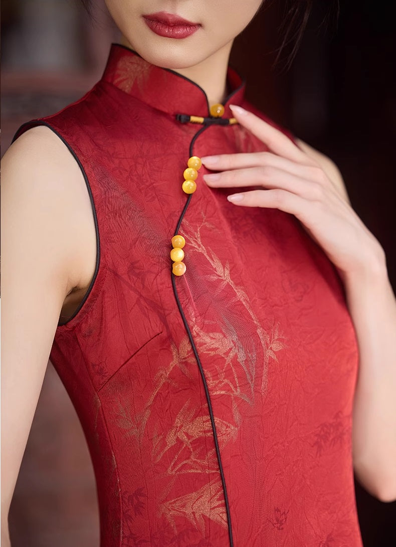 Robe Qipao Cheongsam en Jacquard Rouge sans Manches | Feuilles de Bambou