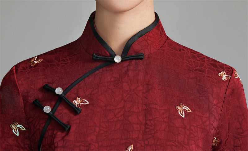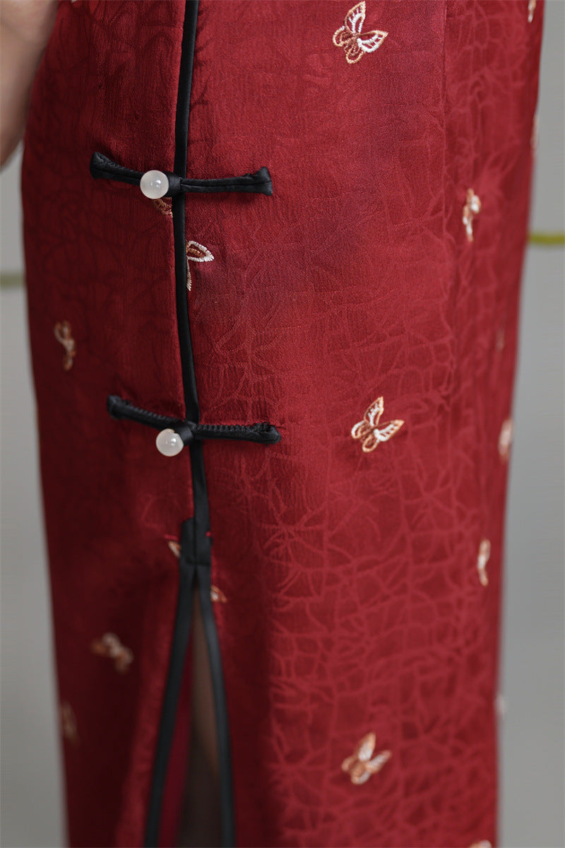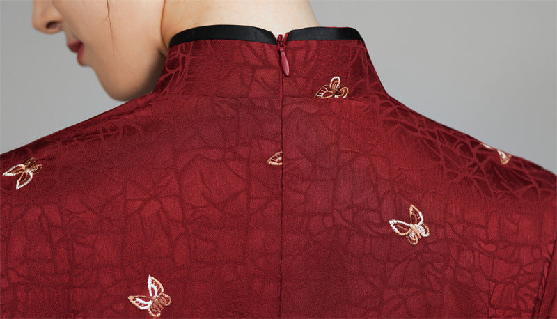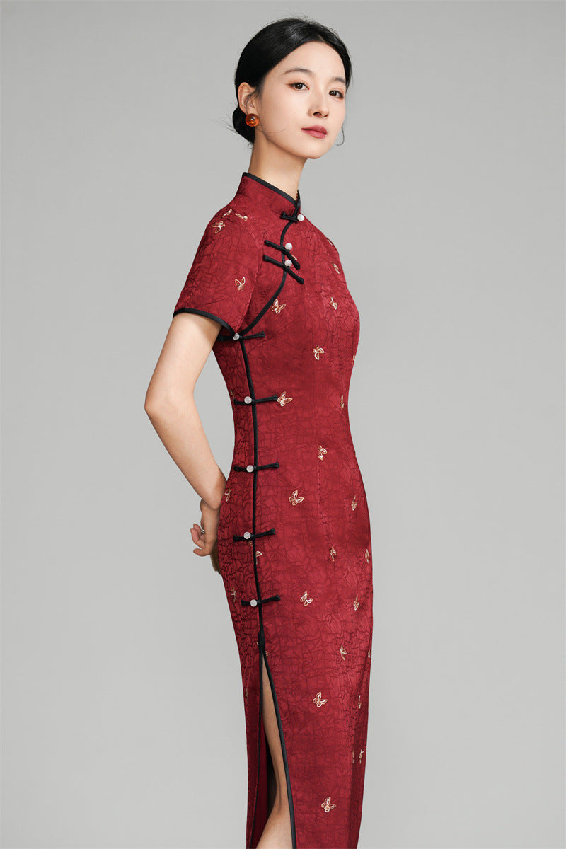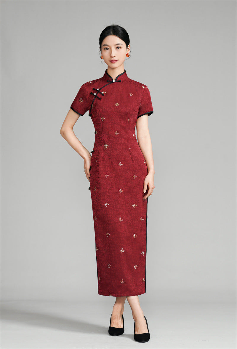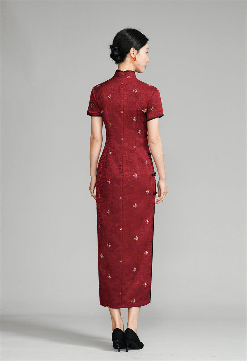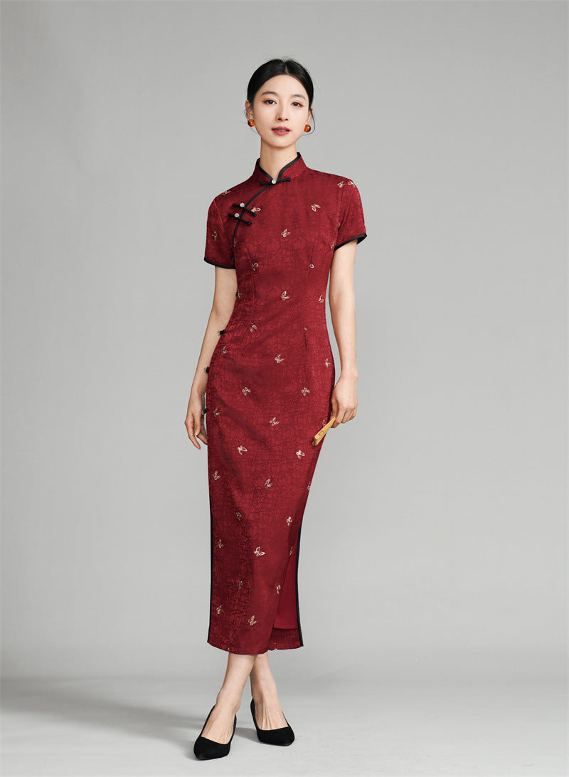 Burgundy Red Short Sleeves Floral Jacquard Qipao Dress