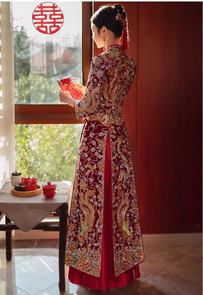 Indulge in the opulent elegance of this 2-piece qun kwa set, made from velvet fabric, embellished with luxurious gold and silver embroidery. The exquisite detailing of dragons, phoenixes, flowers, and lucky clouds graces both the jacket and skirt, while shimmering crystals provide a dazzling touch for an unforgettable ensemble at your tea ceremony.