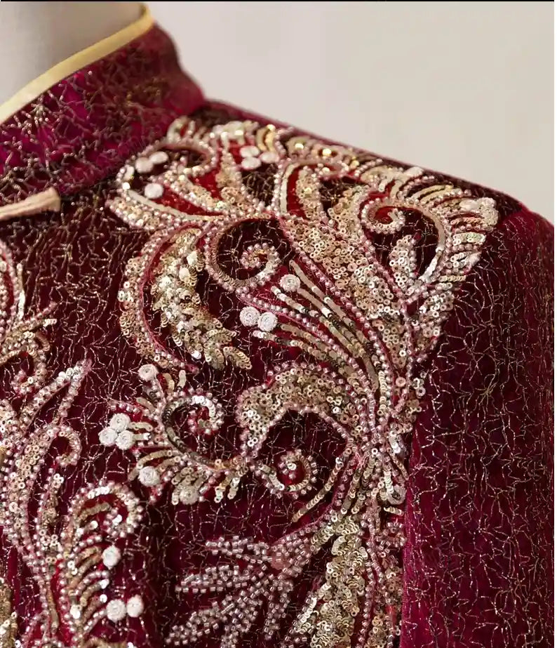 Enhance Chinese wedding traditions with our magnificent crimson and golden groom's ma gua or wedding Tang suit. Embellished with detailed embroidery, sparkling sequins, and exquisite bean decoration, this attire is ideal for grooms or traditional Chinese wedding and tea ceremony.