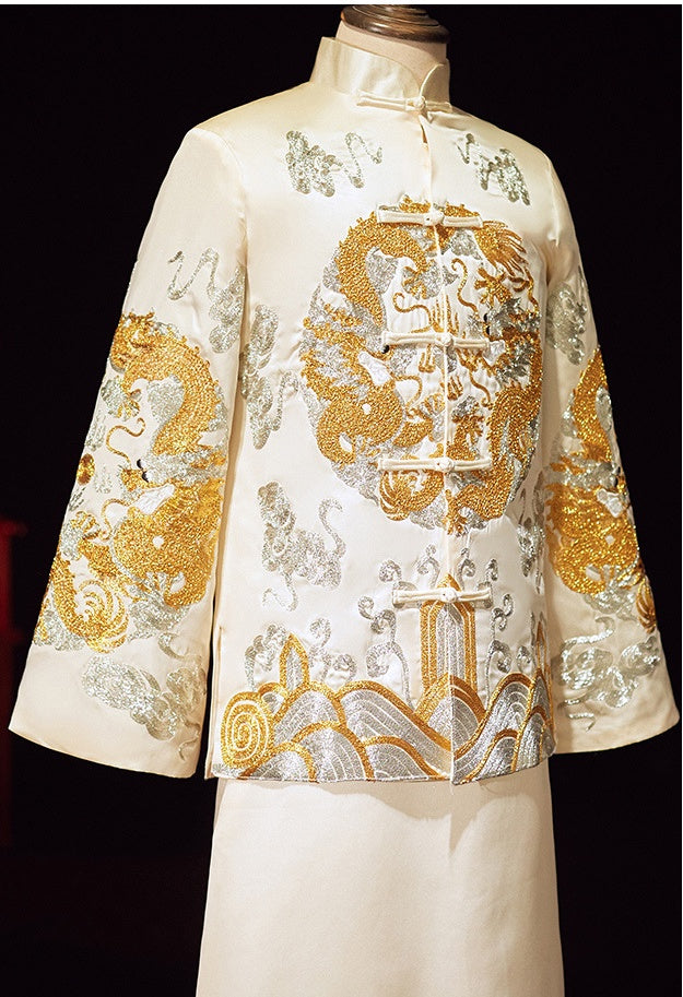 Ivory White and Gold Groom Wedding Dragon Tang Jacket Set