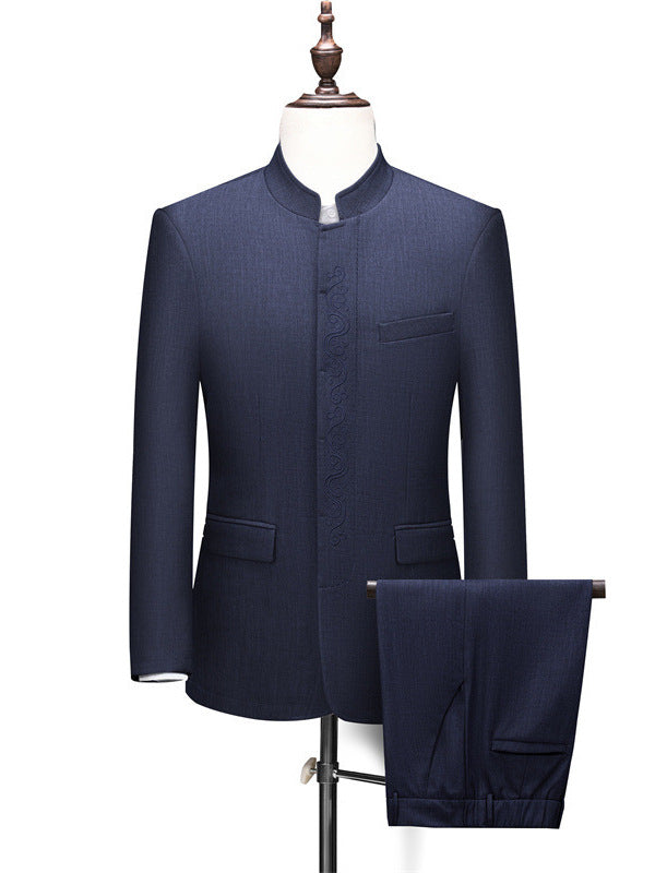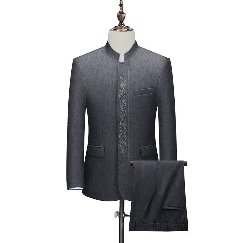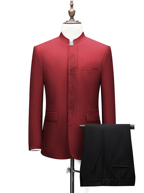 Elevate your formalwear with this elegant Mandarin collar Zhongshan-style jacket. Blending traditional Chinese Tang suit design with a modern tailored fit, this versatile jacket features a structured silhouette, embroidered front detailing, and classic button closure. Available in three refined colors—deep red, slate gray, and navy blue—it's ideal for weddings, cultural events, or adding a touch of heritage to your modern wardrobe.