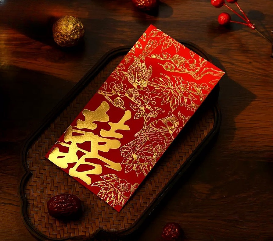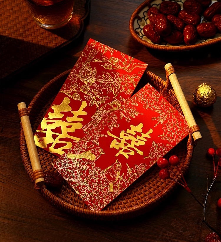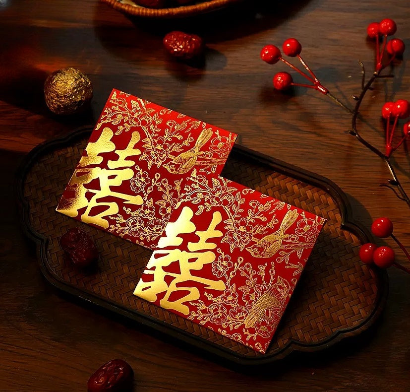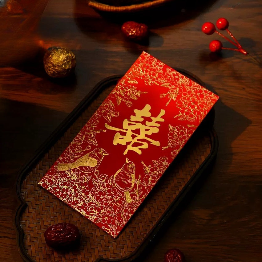 These red envelopes, known as "Hongbao," are an essential part of Chinese celebrations, The envelopes feature the traditional "Double Happiness" symbol in gold, a classic emblem of joy and marital bliss, ideal for weddings. Adorned with gold foil birds and floral motif, symbolize love, harmony, and a prosperous union. A traditional blessing "喜结良缘, 百年好合" "May you have a happy marriage and a long-lasting union." to wish newlyweds a joyful and harmonious marriage that lasts a lifetime.