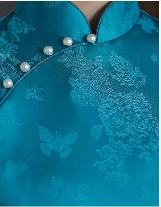 Sleeveless Teal Blue Qipao Dress with Pearl Buttons